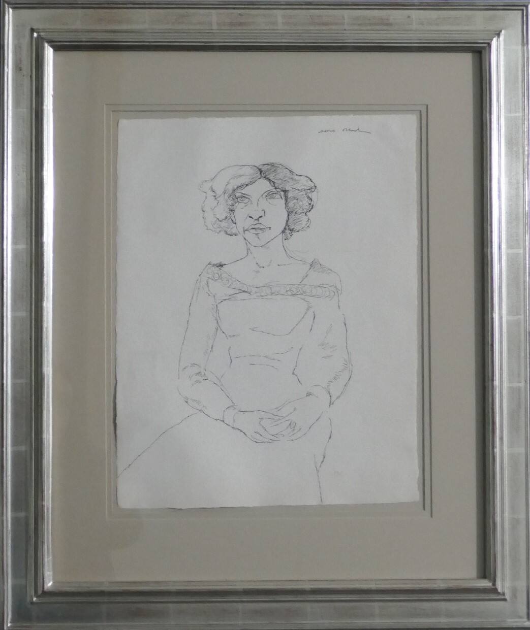 DescriptionThe vertically oriented monochromatic pen-and-ink drawing depicts a woman who faces the viewer in a what appears to be a seated position despite there being nothing shown on which she could sit. She has chin-length wavy hair, wide-set eyes, and full lips. She wears a long-sleeved gown and holds her hands, fingers lightly intertwined, in her lap. The woman fills the composition with the top of her head near the top of the image and the lower portion of her gown extending to the lower left edge.ProvenanceInherited from the artist by his wife, Anna Francis Bloch (1913-2014), 1961-1994;