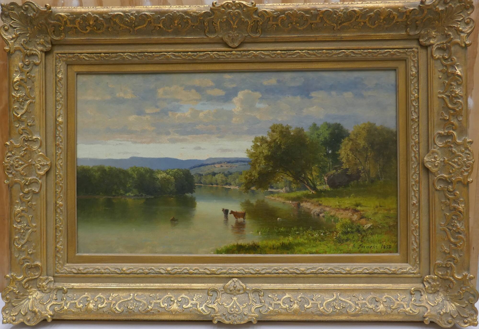 DescriptionThis small, horizontally oriented oil on canvas painting in an ornate gold frame depicts a pastoral landscape in what appears to be the summer season. A wide, shallow stream with cattle standing in it runs through the scene starting at the lower left corner of the composition and continuing back into the image until about the midpoint where it disappears. The bank of the stream in the foreground and at the right-hand side of the composition is grassy. A large tree near the center of the canvas arches over the stream from the right bank. As the scene recedes into the distance, softly rolling hills meet the horizon. The blue sky is dotted with bands of clouds. The painting is signed and dated at the lower right in black paint: "G. Inness 1858."Exhibition HistoryKansas City Collects: A Selection of Works of Art