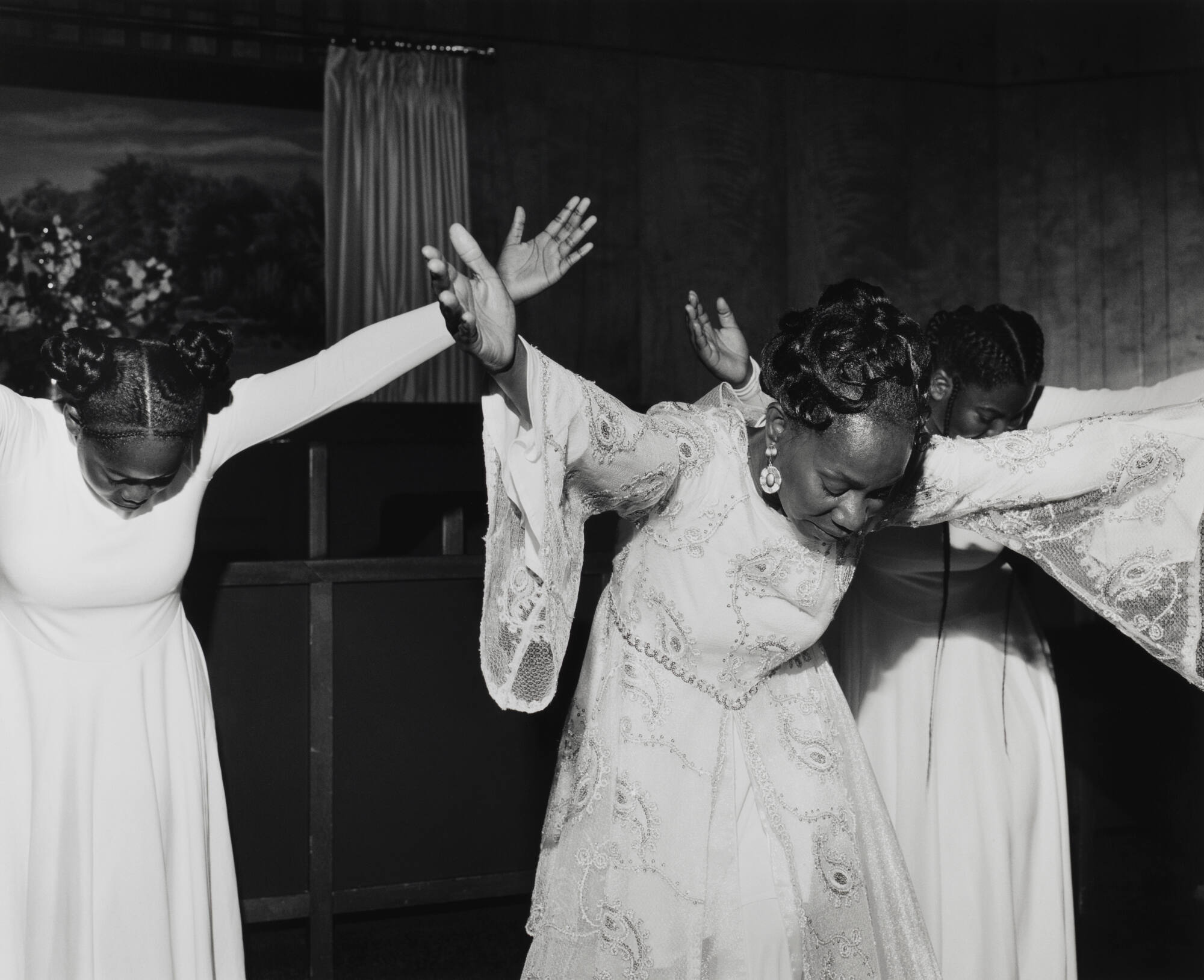 Rahim Fortune traveled to Edna, Texas, where he collaborated with a close friend to create a series of images inspired by her family. This photograph features three women, including his friend's mother, participating in a long-standing Baptist tradition known as praise dancing, a form of worship through music and dance. A regular ritual in Black Baptist churches, Fortune says, it "dates back to the early years of emancipation and most likely further back to an African tradition."
