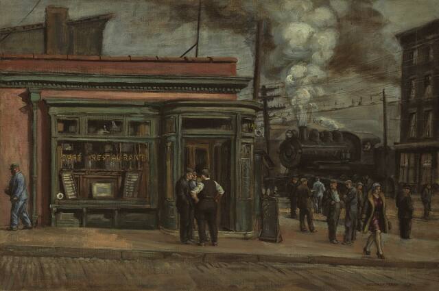 Norman Sasowsky, Catalogue of Reginald Marsh Paintings, ms, vol. 3, no. 28–17 (as Street Scene in Front of “Café Restaurant”).