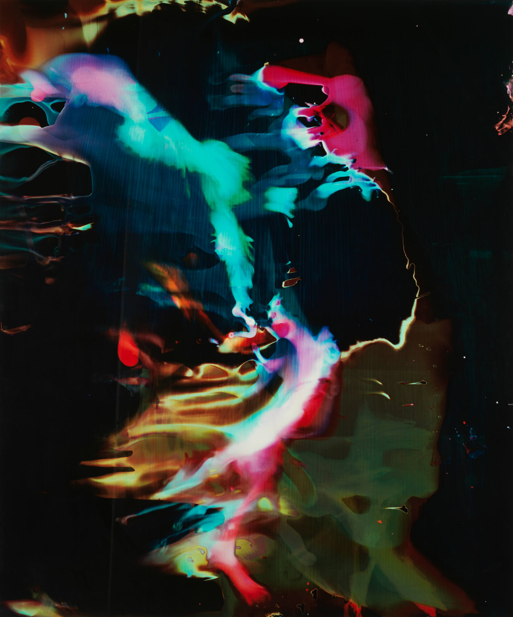 DescriptionImage of a multi-colored abstraction composed of deeply saturated organic shapes undulating across a black background.Copyright© Mary Wessel