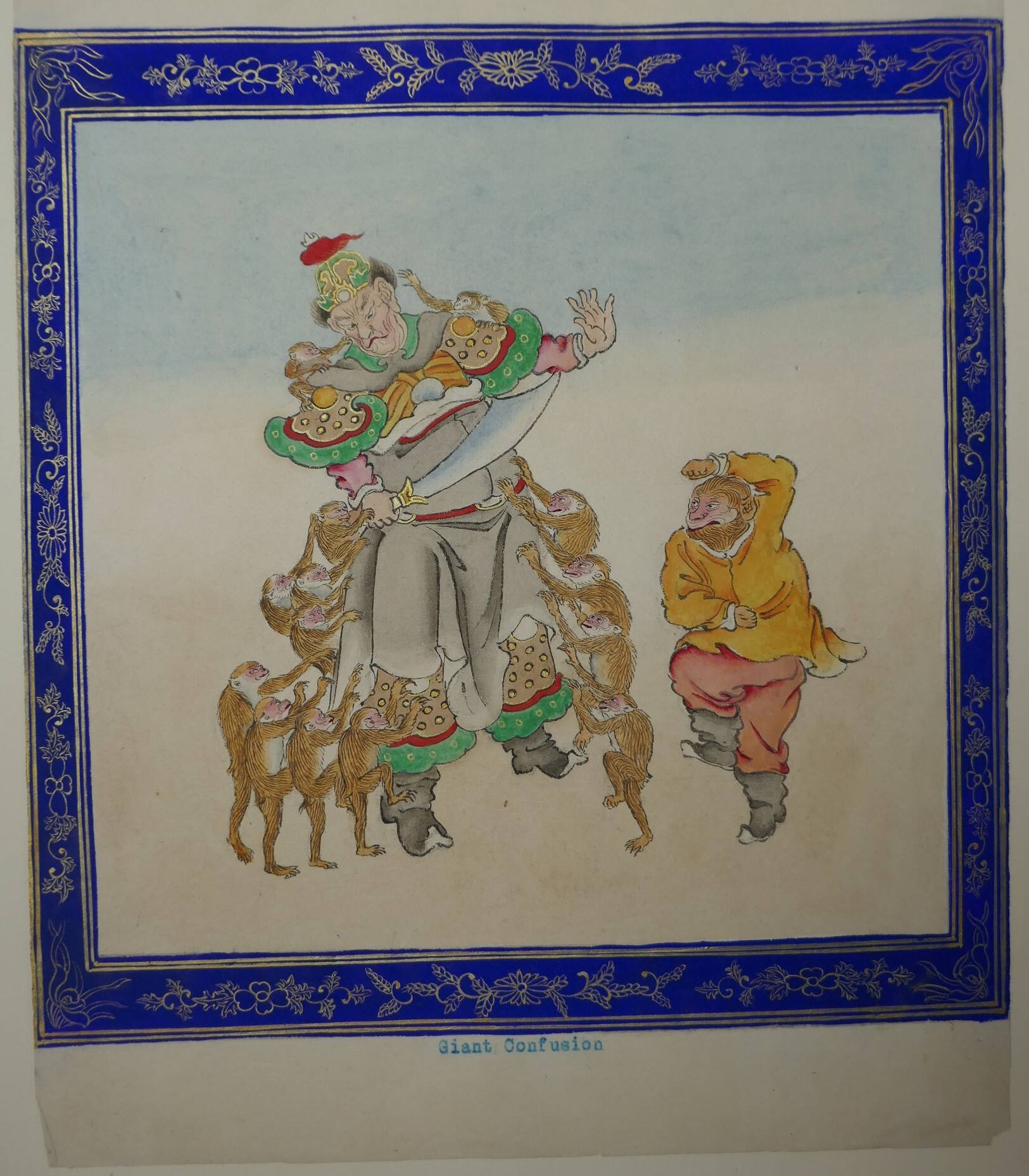 DescriptionThe painting in ink, color, and gold, features a square scene of a giant surrounded by several monkeys framed by the painted border of floral pattern in gold on blue ground. It is a leaf from the album of 40 leaves depicting the popular story of Journey to the West (Xiyouji). Below the painting is a brief typescript caption in English, possibly added by James Ware.ProvenanceJames Ware (1859-1913)