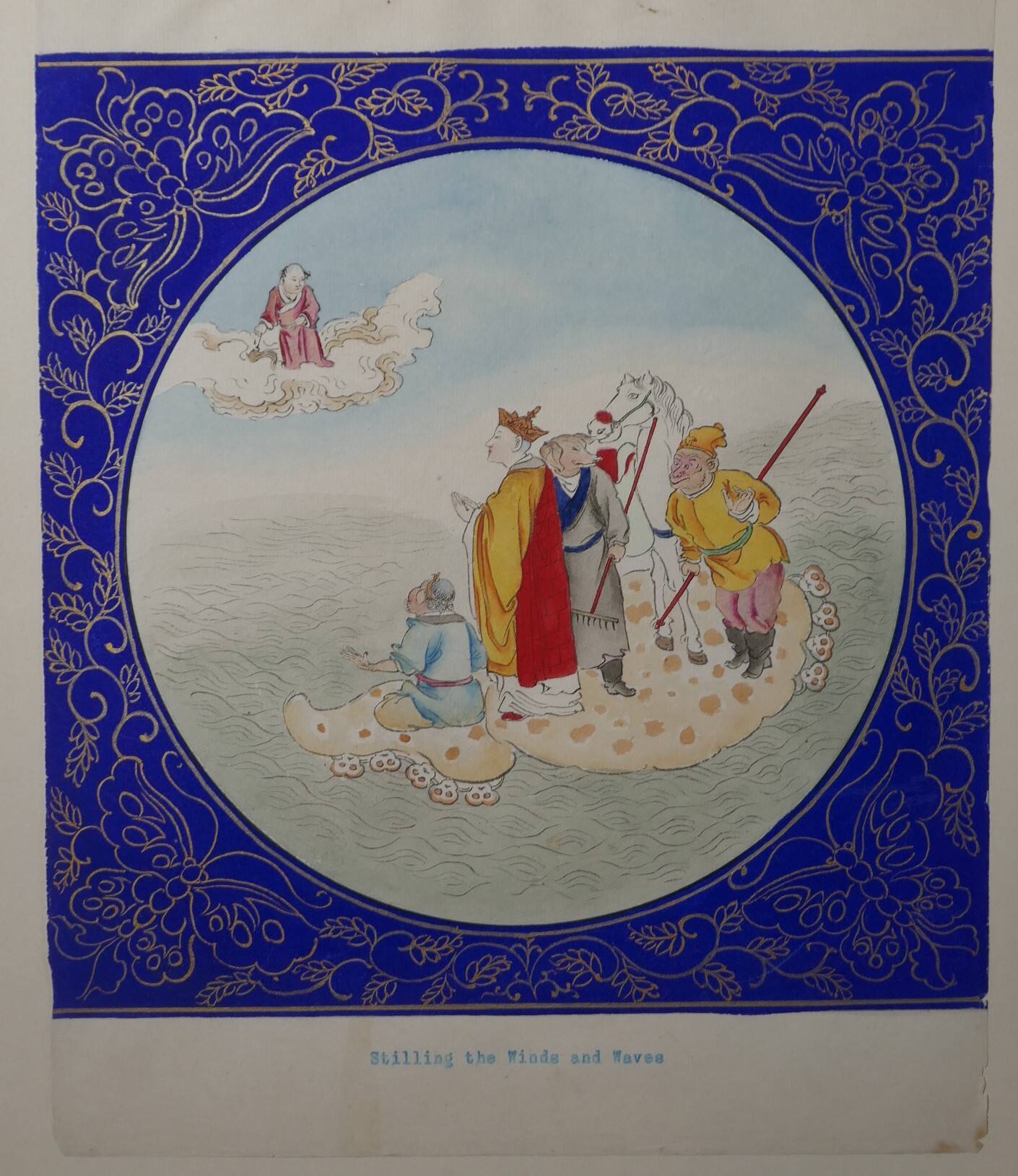Based on a novel attributed to Wu Cheng’en (about 1500–1582), these works from an album illustrate the story of Sun Wukong, or the Monkey King, who seeks to transform himself into a superhero. His behavior, however, brings trouble to the spiritual realm. The Buddha must punish him, but Guanyin converts him into a helper. The Monkey King then escorts a monk along with guards named Pigsy, Sandy, and Dragon Horse on a journey from China to India to attain Buddhist scriptures. The album artist animated the episodes using a colorful style similar to the emerging newspaper or poster illustrations of the late 1800s. These illustrations for different episodes of the novel demonstrate the enduring charm of this popular story.