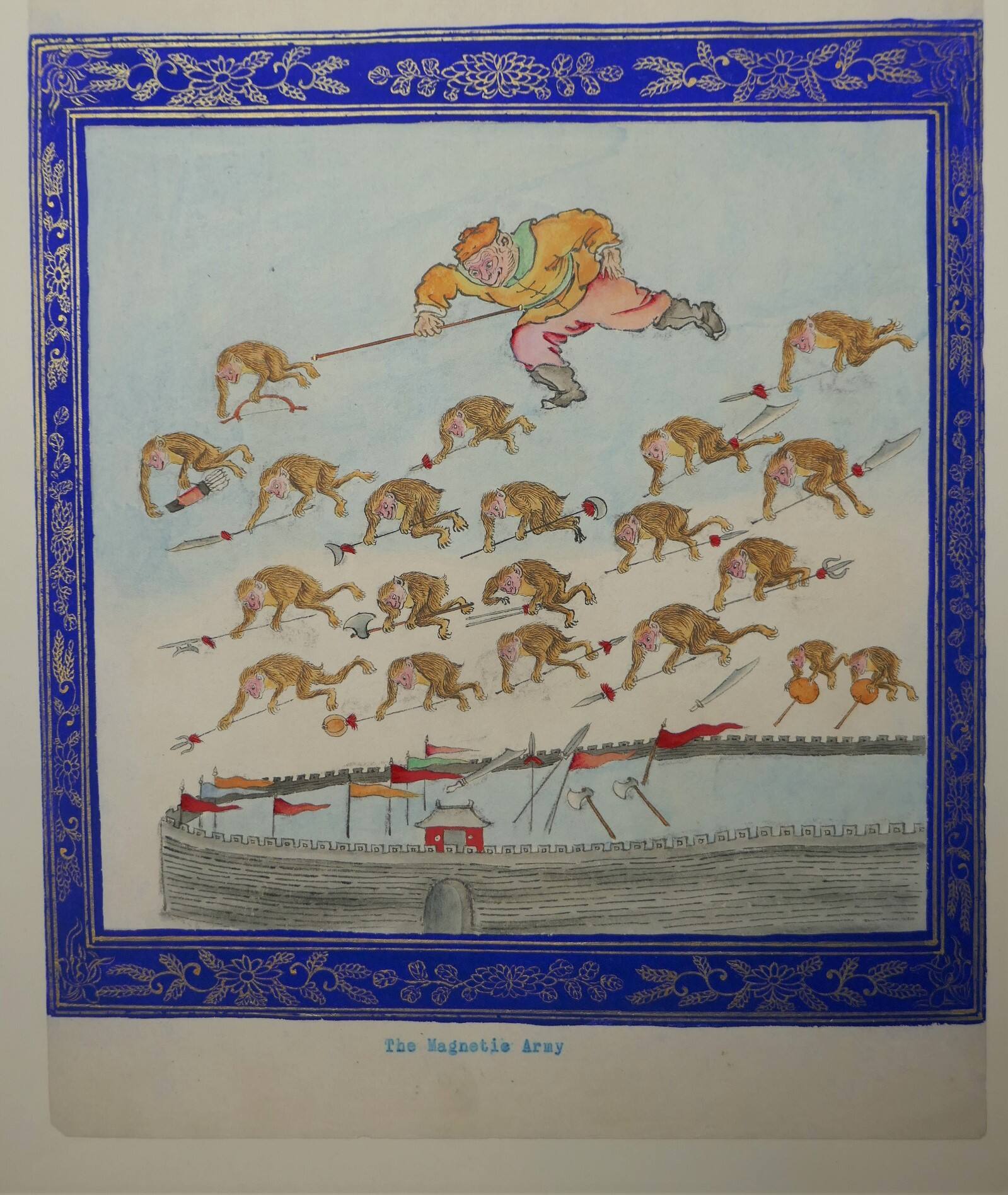 DescriptionThe painting in ink, color, and gold, features a square scene of one clothed monkey above twenty smaller monkeys framed by the painted border of floral pattern in gold on blue ground. It is a leaf from the album of 40 leaves depicting the popular story of Journey to the West (Xiyouji). Below the painting is a brief typescript caption in English, possibly added by James Ware.ProvenanceJames Ware (1859-1913)