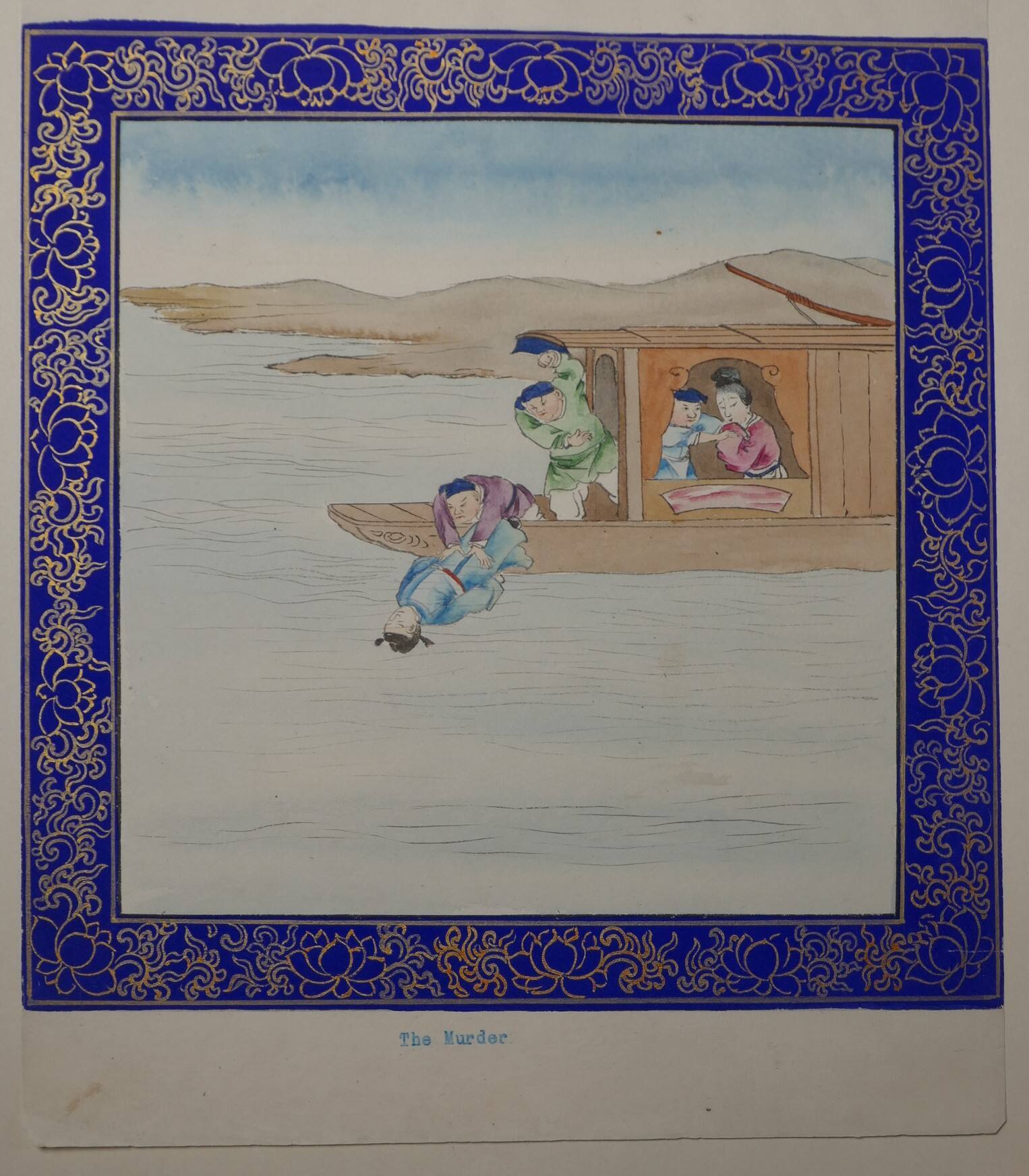 DescriptionThe painting in ink, color, and gold, features a square scene of five figures framed by the painted border of floral pattern in gold on blue ground. It is a leaf from the album of 40 leaves depicting the popular story of Journey to the West (Xiyouji). Below the painting is a brief typescript caption in English, possibly added by James Ware.ProvenanceJames Ware (1859-1913)