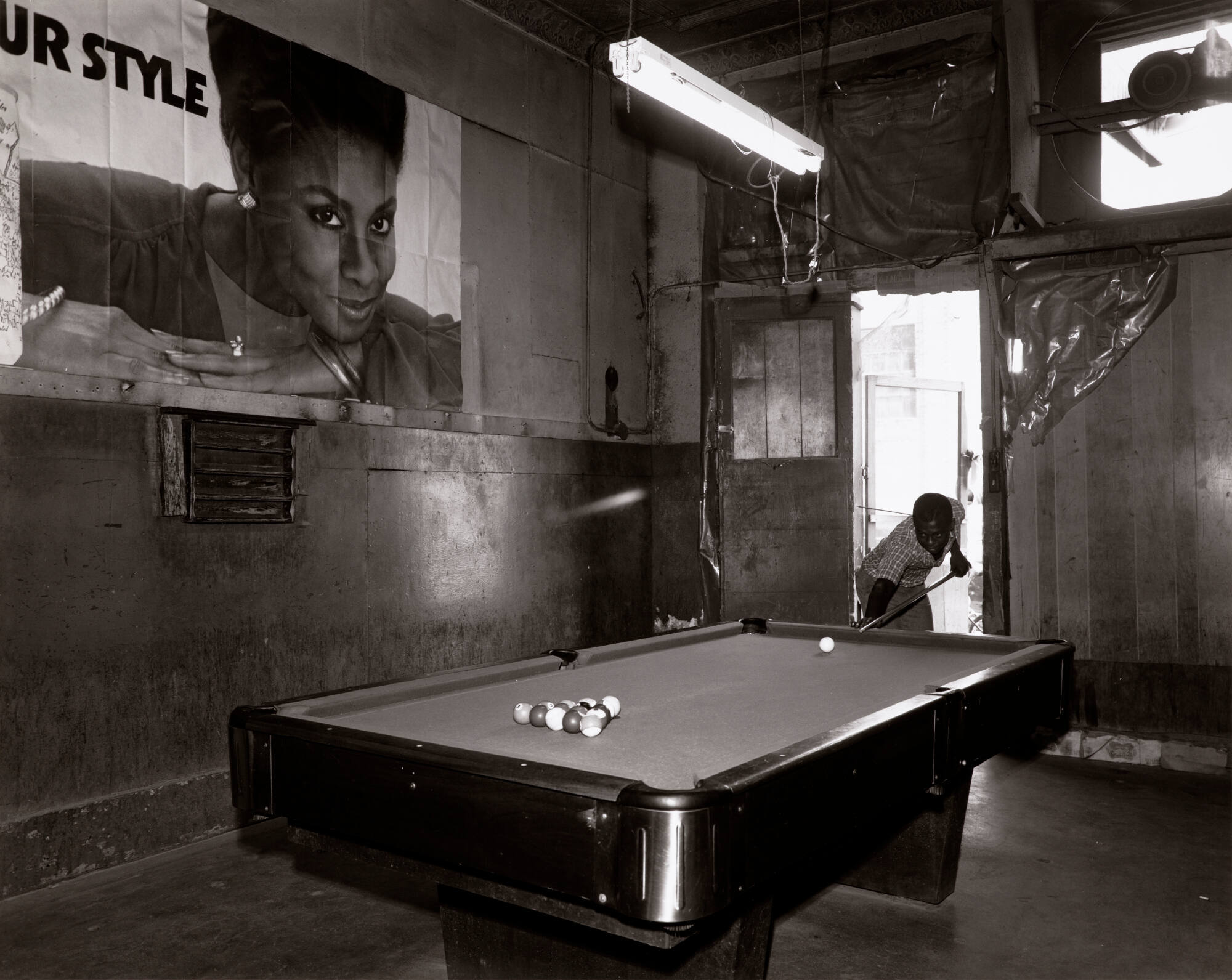 DescriptionImage of a young man wearing a short-sleeved plaid shirt playing pool. He stands in front of an open screen door filled with sunlight. A large poster of a smiling woman is displayed on the wall to the left and a florescent light hangs above the pool table.Provenance