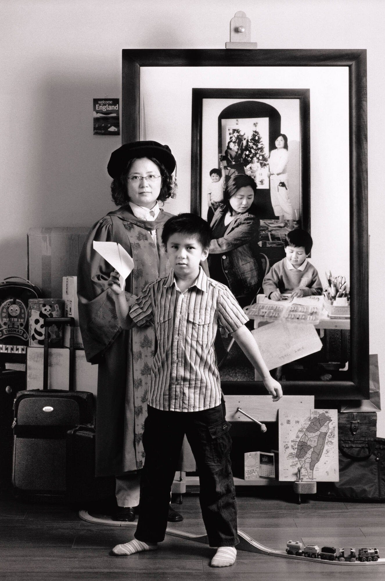 DescriptionImage of a woman wearing a graduating cap and gown standing next to a young boy who is holding a paper airplane. A large framed photograph of the woman and child is displayed on an easel behind them.ProvenanceAnnie Hsiao-Ching Wang, Taiwan, 2023;