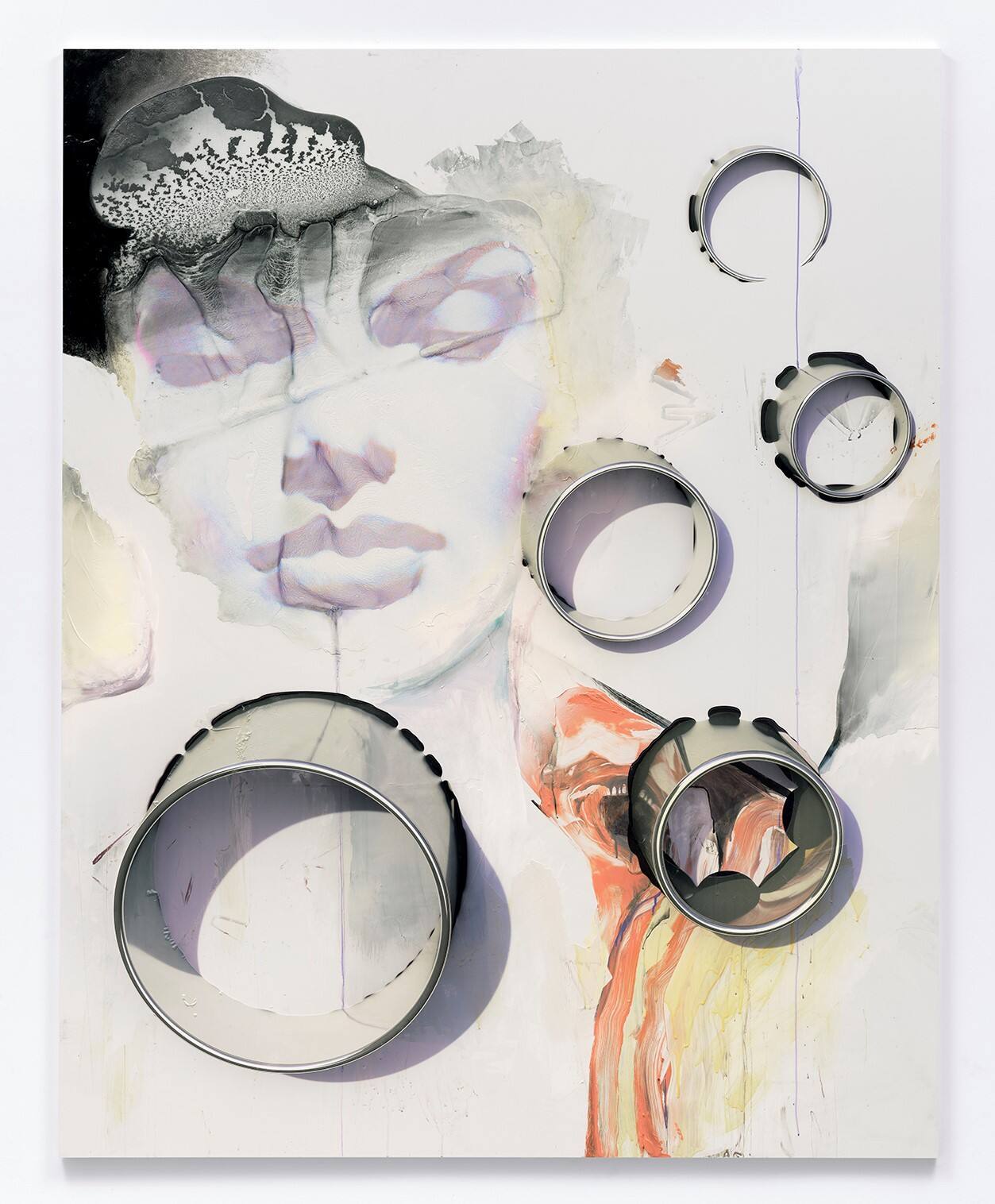 DescriptionThis large, vertically oriented painting features a woman’s face in lavender and gray hues its upper-left quadrant. Her eyes are downcast or closed and her lips are full. The surface of the paint in this area of the woman’s face is finely wrinkled. In the upper left corner, above the woman’s eyes, is a black shape reminiscent of an ink spill. Five metallic-looking silver rings that appear convincingly three dimensional and reflective cascade from the upper right corner of the painting down to the lower left. They increase in diameter as they near the lower edge of the aluminum panel. Behind the ring closest to the lower right corner and extending down to the lower edge of the panel is a smear of paint that ranges from a coral-red color, gray, and lilac, to beige. The background of the painting is white. Throughout the image, there are visible brush strokes and thick areas of paint that contrast with the smoothness of other areas.Exhibition HistoryArdomancer, April