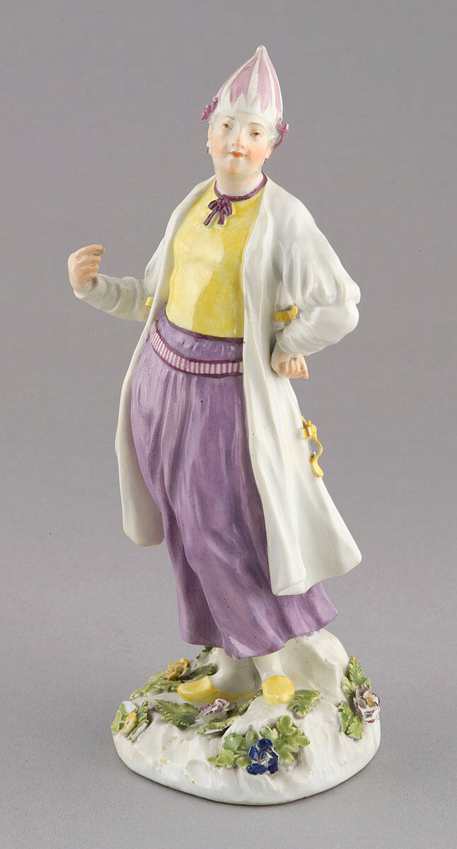 DescriptionOn base with flowers in relief, standing figure wearing lavender trousers, white coat with yellow ties, yellow blouse with purple tie, pointed white turban with purple stripes, purple earrings, yellow, pointed shoes; left hand on hip, head turned l., right hand pointed toward face, right arm bent at elbow. Crossed swords mark.