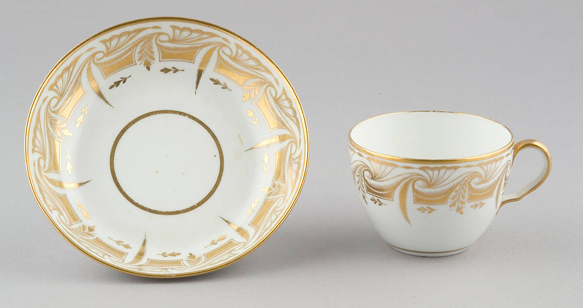 DescriptionCup: of white porcelain, gilt handle, decorated around top with wide border of gilt in formal design, and continuous leaf pattern. Saucer: of white porcelain decorated on inside with gilt border in formal design, and continuous leaf pattern.Provenance
