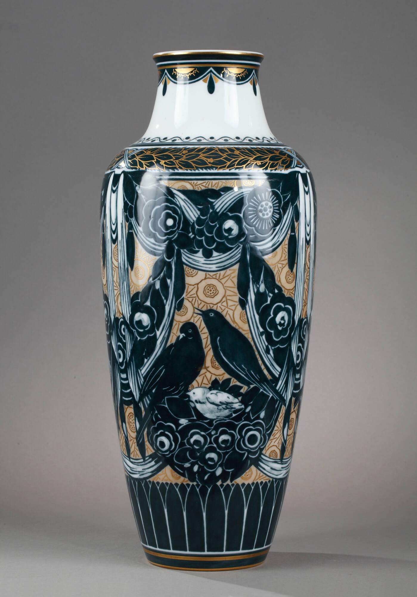 Manufactured at the Sèvres Porcelain Manufactory, Sèvres, France, 1924, as Vase d’Alençon, guirlande et oiseux noir verte [1];