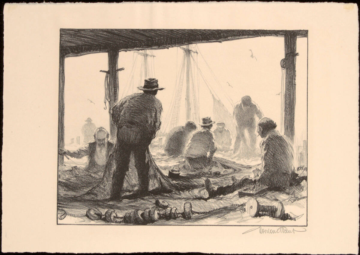 DescriptionA group of ment are gathered under some open-air structure. In the distance is a ship and birds flying overhead. The men, mostly sitting or crouching, are surrounded by nets, and spools litter the foreground.Copyright© Estate of Gordon Grant