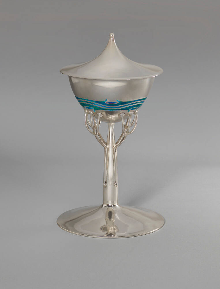 DescriptionBlue and green "floating" enamel on stamped decoration on exterior of bowl; cast and applied organic design elements from bowl to shaft.Gallery LabelThe sinuous, flowing bands of inlaid blue and green enamel that encircle this cup reflect the naturalistic qualities of the Art Nouveau style. The delicate, curvilinear branches sprouting from the cup's stem are characteristic of this organic style, popularized in the late 19th to early 20th centuries. Also inspired by the interlaced patterns of Celtic design, the cup was part of Liberty & Company's Cymric line of silver sold by Arthur Liberty's retail venture that promoted good design and cost-lowering modern manufacturing. The cup's designer, Archibald Knox, was born on the Gaelic Isle of Man and was thus perfectly suited for the Cymric collection.