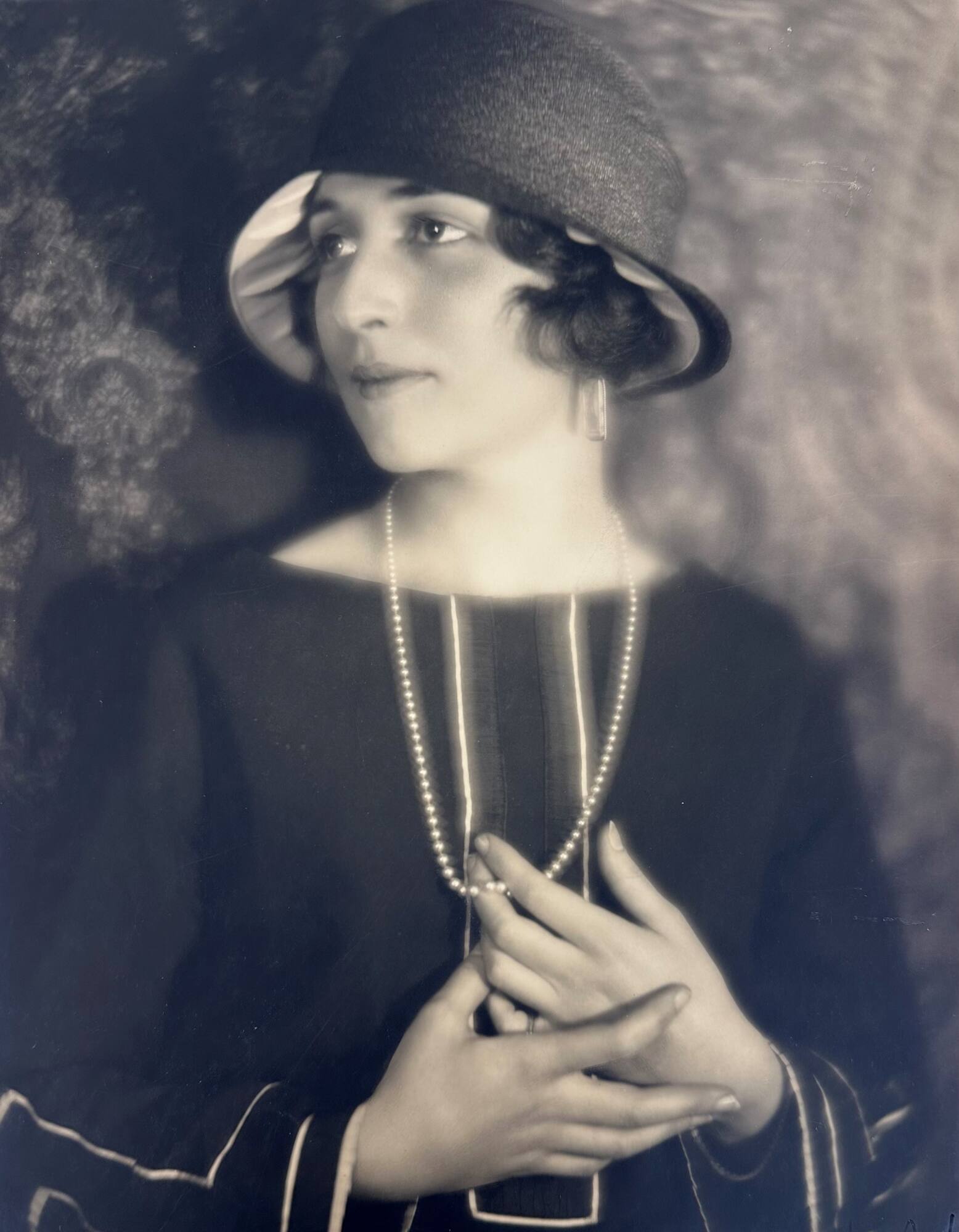 DescriptionPortrait of a woman with short hair wearing a hat, collarless long-sleeved dress, and pearl necklace.