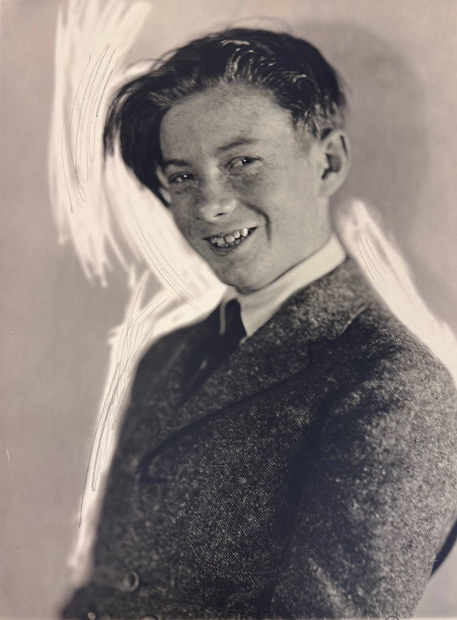 DescriptionPortrait of a smiling boy with freckles wearing a tweed jacket, collared shirt, and dark tie. Much of the background has been removed and sweeping pencil markings have been added.