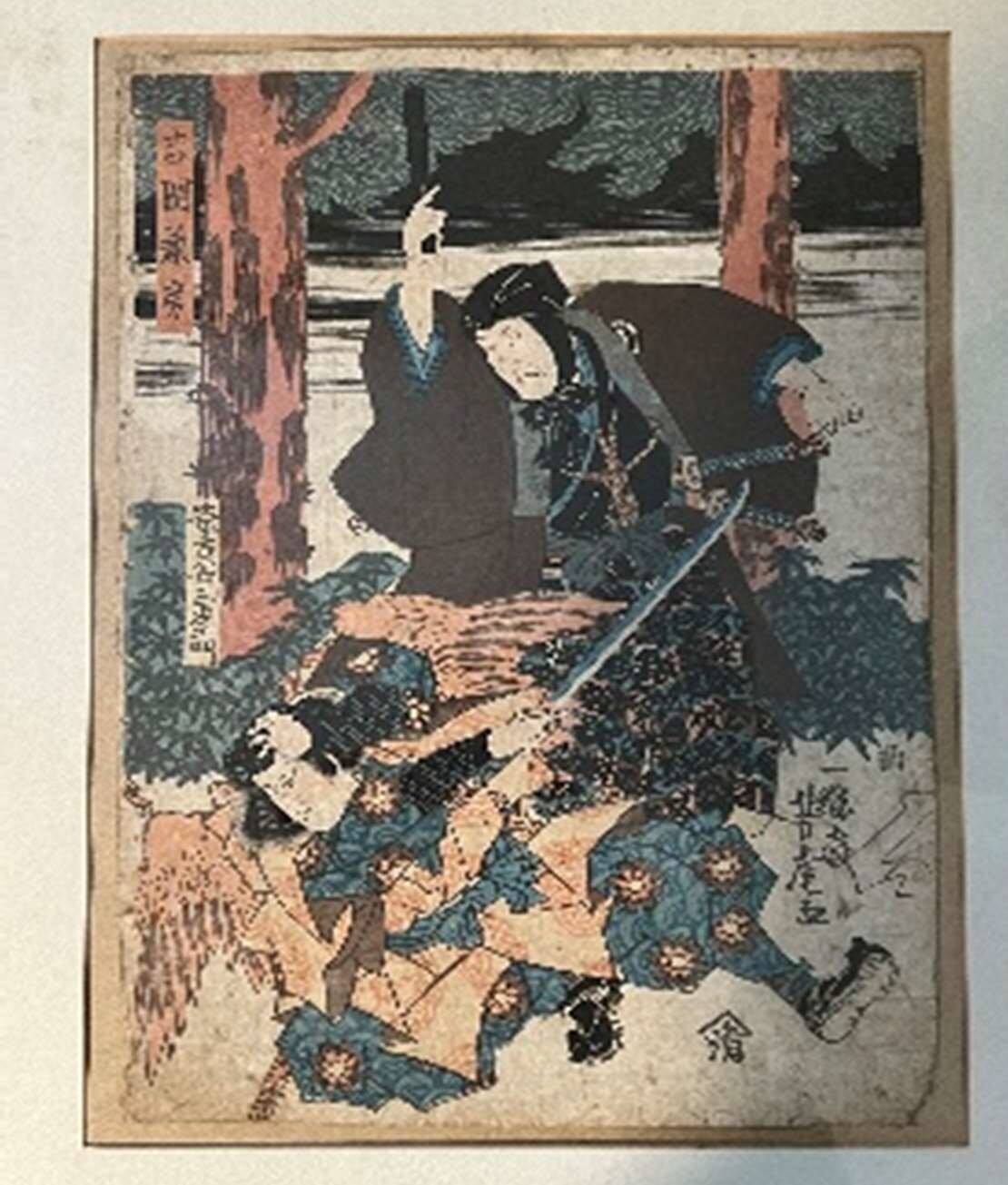DescriptionThis is a polychrome ōban woodblock print. It depicts two figures: Yoshioka Kanefusa 吉岡兼房and Nagoya Sanzaemon 奈古谷三左エ門. Their names appear in the two cartouches on the left. Yoshioka Kanefusa (active in the second half of the sixteenth century), also known as Yoshioka Naotsuna, was a historical figure known for his swordsmanship. He stands in the middle, raising his arm, holding a black, closed folding fan. A black cloth covers his head. He is wearing a dark-drown haori (jacket) and a pair of hakama(pants) with shippō (Seven Treasures) patterns. Nagoya Sanzaemon appears to be playing the role of tengu, a winged supernatural being with a small hat of yamabushi (mountain priest). Sanzaemon covers his head with his left arm to defend himself from Kanefusa.