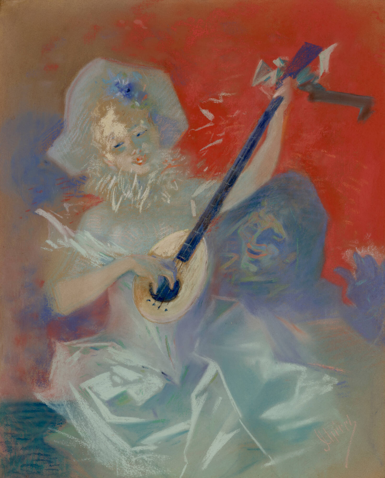 DescriptionA pastel drawing of a seated blond-haired woman wearing a pale blue dress, neck ruff, and wide-brimmed hat, playing a long-necked lute. In the blue shadows behind her is the face of a smiling man wearing a hat. They are framed by a bright red background in the upper right corner.Provenance