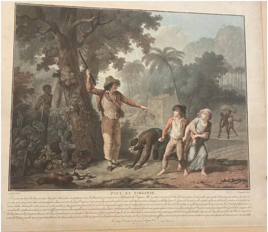 Lettered bottom: Un jour, au lever de l’aurore, une Négresse Maronne se présenta sous les bananiers qui entouroient l’habitation de Virginie. Elle se jeta a ses pieds, et lui dit : ( Ma jeune Demoiselle, ayez pitié d’une pauvre esclave fugitive ; il / y a un mois que j’erre dans ces montagnes demi-morte de faim. Virginie, toute émue, lui répondit : « Rassurez-vous, infortunée créature ! Mangez) ; et elle lui donna le déjeûner de la maison, la voyant rassasiée, elle lui dit : ( Pauvre misérable ! j’ai / envie d’aller demander votre grace à votre maître ; ) elle appela son frere, et le pria de l’accompagner. Enfin, vers le milieu du jour, ils arriverent sur les bords de la Riviere-noire. Ils apperçurent là une maison bien bâtie, des plantations / considérables, et plusieurs esclaves occupés à différents travaux. Leur maître se promenoit au milieu d’eux. C’étoit un grand homme sec, olivâtre, aux yeux enfoncés, et aux sourcils noirs et joints. Virginie, toute émue, tenant Paul par le bras, s’approcha / de l’habitant, et le pria, pour l’amour de Dieu, de pardonner à son esclave. L’habitant ne fit pas grand compte de ces deux enfants pauvrement vêtus ; mais quand il eut remarqué la taille élégante de Virginie, sa belle tête blonde, et qu’il eut / entendu le doux son de sa voix, qui trembloit en lui demandant grace, il ôta sa pipe de sa bouche, et levant son rotin vers le ciel, il jura par un affreux serment qu’il pardonnoit à son esclave, non pas pour l’amour de Dieu, mais pour l’amour d’elle.
