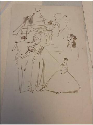 DescriptionA drawing in ink on the recto of the paper of several people. At left, a man in a soldier's uniform with his right arm held behind him, and a woman, her arm in the crook of his elbow and wearing in a long dress, walk away from the viewer. To their right is a smaller scale drawing of a woman in a black hat and very wide dress. Above her is the caricatured profile of a figure, maybe a man with a narrow beard and poofy hair. At upper center a man in a vaguely Tudor-style outfit stands facing away from the viewer. Other partially finished sketches are in the upper parts of the paper.On the verso of the paper is a drawing of three people: a woman in an elegant, slim-fitting gown holding an open fan; to our right is a short man with a dark mustache and wearing a tuxedo; and farther to our right is a tall man wearing an eighteenth-century style costume and powdered wig. His mouth is open as if he is singing. At lower right is an empty arm chair, facing the group of 3 people.Exhibition History