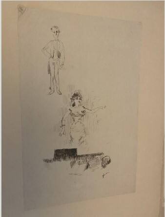 DescriptionA drawing in pen and ink on paper of a man at upper right, who wears a suit with tails; a woman lower center in a corseted dress, her left arm raised, her mouth open as if to sing, and below her the edge of the stage with two music stands below that and part of a man's bald head. The drawing is signed at lower right: forainExhibition History[None known at this time.]
