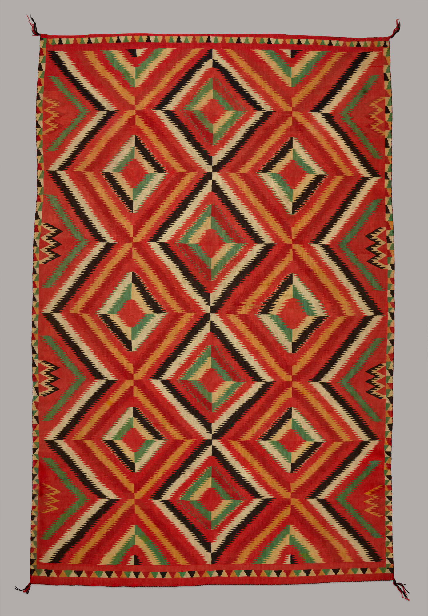 DescriptionWoven textile consisting of repeated serrated diamonds and other geometric designs on a red ground.ProvenanceSusan De Jong, Santa Fe, New Mexico;