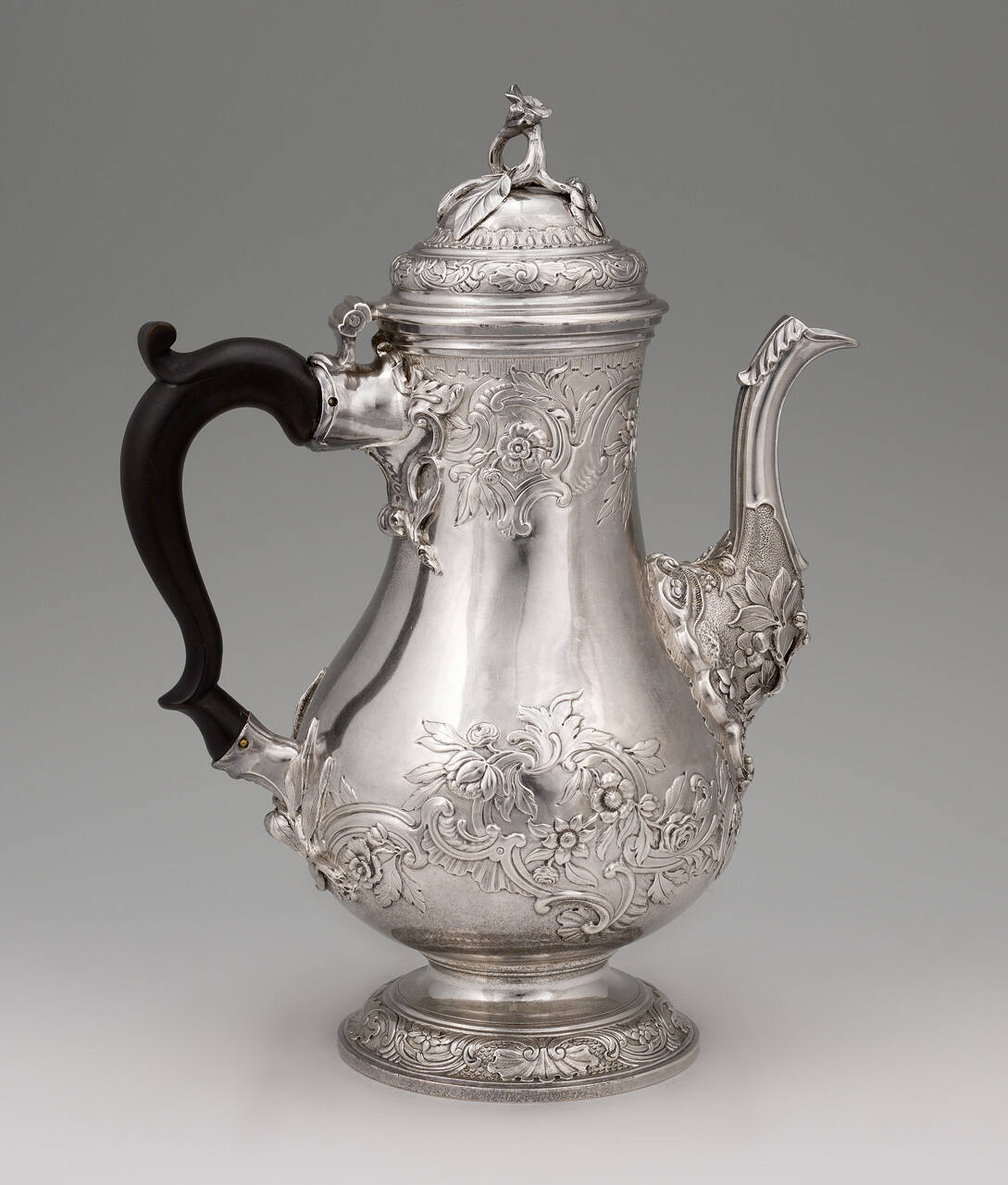 DescriptionSilver coffee pot chased with scrolls and foliage in relief on body, spout, domed lid, and foot. A coat-of-arms (Sir George Colebrook and wife) is engraved within the decoration. The tall finial on the lid is topped by a flower. Double scroll wood handle.Gallery LabelThe robust profile of this coffee pot depicts the boldness of the Baroque style, while the dynamic scrolls of the floral motifs suggest the lightness of the Rococo. This latter style was embraced by London silversmiths but was tempered with a restrained elegance particular to England. Abraham Portal followed Paul de Lamerie, to whom he was apprenticed, in grounding vigorously decorated designs onto substantial forms.