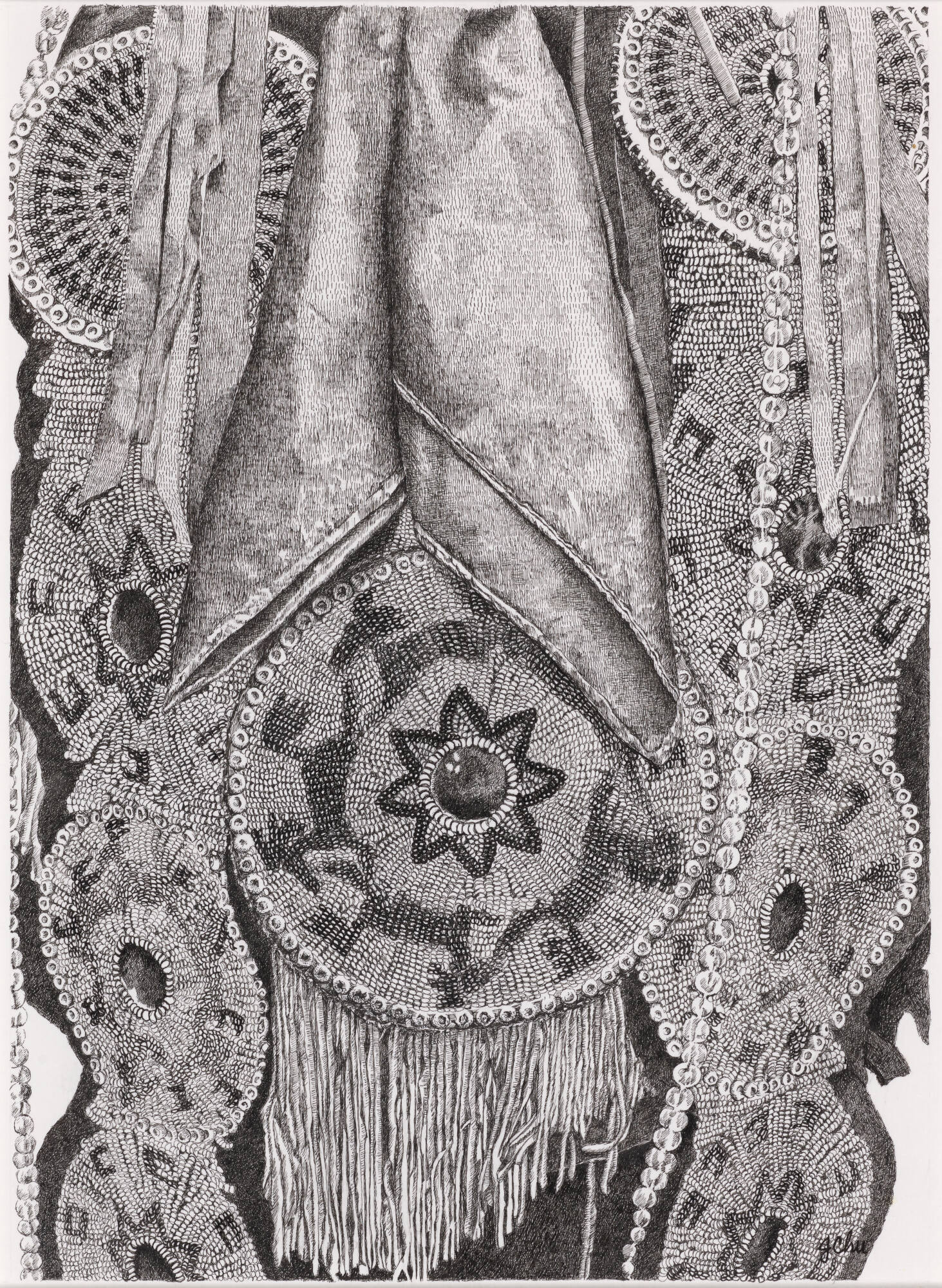 DescriptionThis vertically oriented black-and-white drawing features an arrangement of beaded Native American regalia. A beaded cloth drapes down the center of the image in three different panels. The panels to the left and right are nearly identical. Each starts with an elaborate radial design with a border in a lighter shade of beads and ribbon, followed by a cascading zig-zag design, then another radial design that features a circular hole surrounded by a sunburst and small “c” shaped symbols that go round the border. Another radial with a lighter colored border followed by the same sunburst radial design are cut off by the bottom of the image. The center panel of the beaded cloth is a larger radial design; there is what appears to be a gem in the center surrounded by a starburst design with eight triangles, abstracted figures of horses gallop in a circle around the starburst, and they are surrounded by a border of larger light-colored beads. Fringe hangs off the bottom edge of the large center panel, and the two panels to its side continue to drape past the fringe. The entire beaded cloth is on a dark backdrop that is shaped to frame the radial designs. Draped on top of the center panel is a kerchief folded to its corners, then in half so that two triangular forms seem to frame the large center circular design. Four pieces of ribbon sit to both the left and right sides of the kerchief. A string of jewels drapes down the right side of the image, between the kerchief and the ribbons. The string of jewels on the left side is not completely in the image.Exhibition HistoryJane Chu: 50 States: America & Beyond, Sherry Leedy Contemporary Art, Kansas City, Missouri, September 2–October 22, 2022, no. 42.