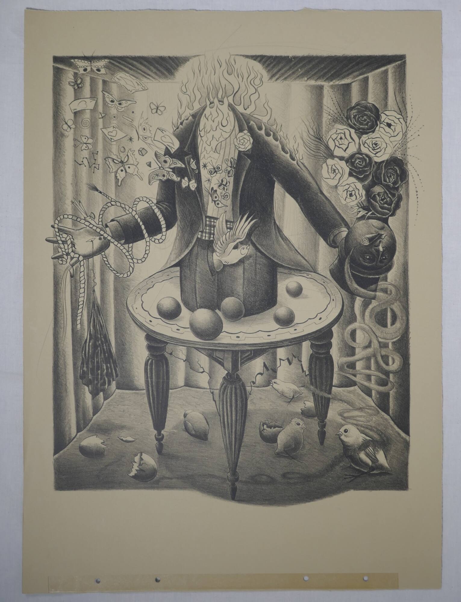 DescriptionThis key stone lithograph is printed all in black on tan paper. At the center, a man’s torso dressed in a jacket, trousers, a striped shirt, and a checked cummerbund sits on a table with bulging legs that end in points. Five balls of different rest on the table. The figure has no neck or head; flames cover the top of him, cascading over his shoulders and down his back. His proper left hand holds a head or helmet from which sprouts a bouquet of roses; an elaborately looped rope dangles below it. On the lower right, four parakeets under the table. His proper right arm ends in a metallic hand held wide open. A robe loops around the arm and hand and a spotted cloth hangs from it. In the upper left corner, butterflies and playing cards. A curtain in undulating folds in the background.Provenance