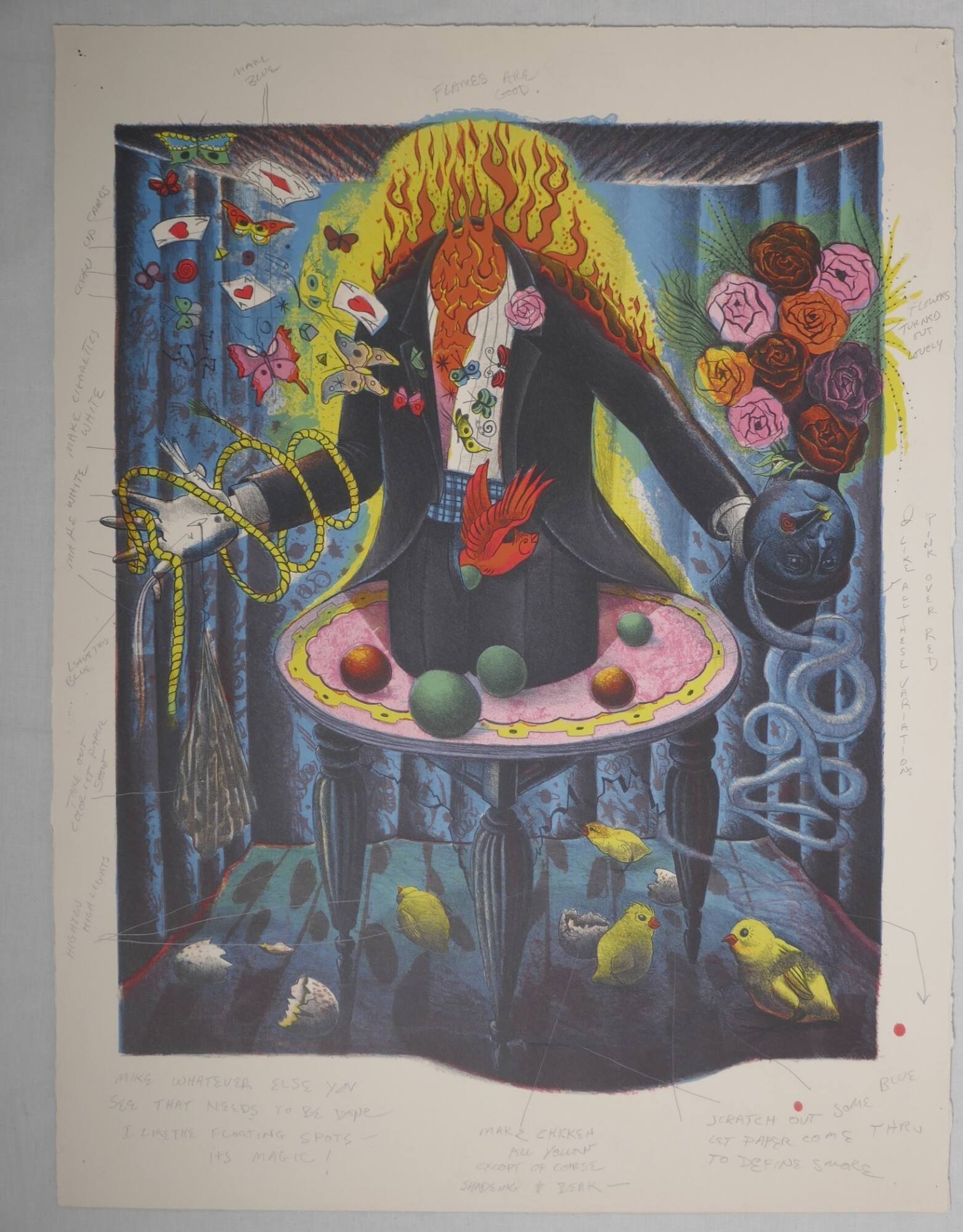 DescriptionThis full-color proof with multiple notations depicts at its center, a man’s torso dressed in a black jacket, black trousers, a white shirt with black stripes, and a blue and black checked cummerbund sits on a pink table with a yellow rim and bulging black legs that end in points. Five balls of different colors rest on the table. The figure has no neck or head; red and yellow flames cover the top of him, cascading over his shoulders and down his back. His proper left hand holds a blue head or helmet from which sprouts a bouquet of roses; an elaborately looped rope dangles below it. On the lower right, four yellow parakeets under the table. His proper right arm ends in a metallic hand held wide open. A yellow robe loops around the arm and hand and a spotted cloth hangs from it. In the upper left corner, butterflies and playing cards. A blue curtain in undulating folds in the background.Provenance