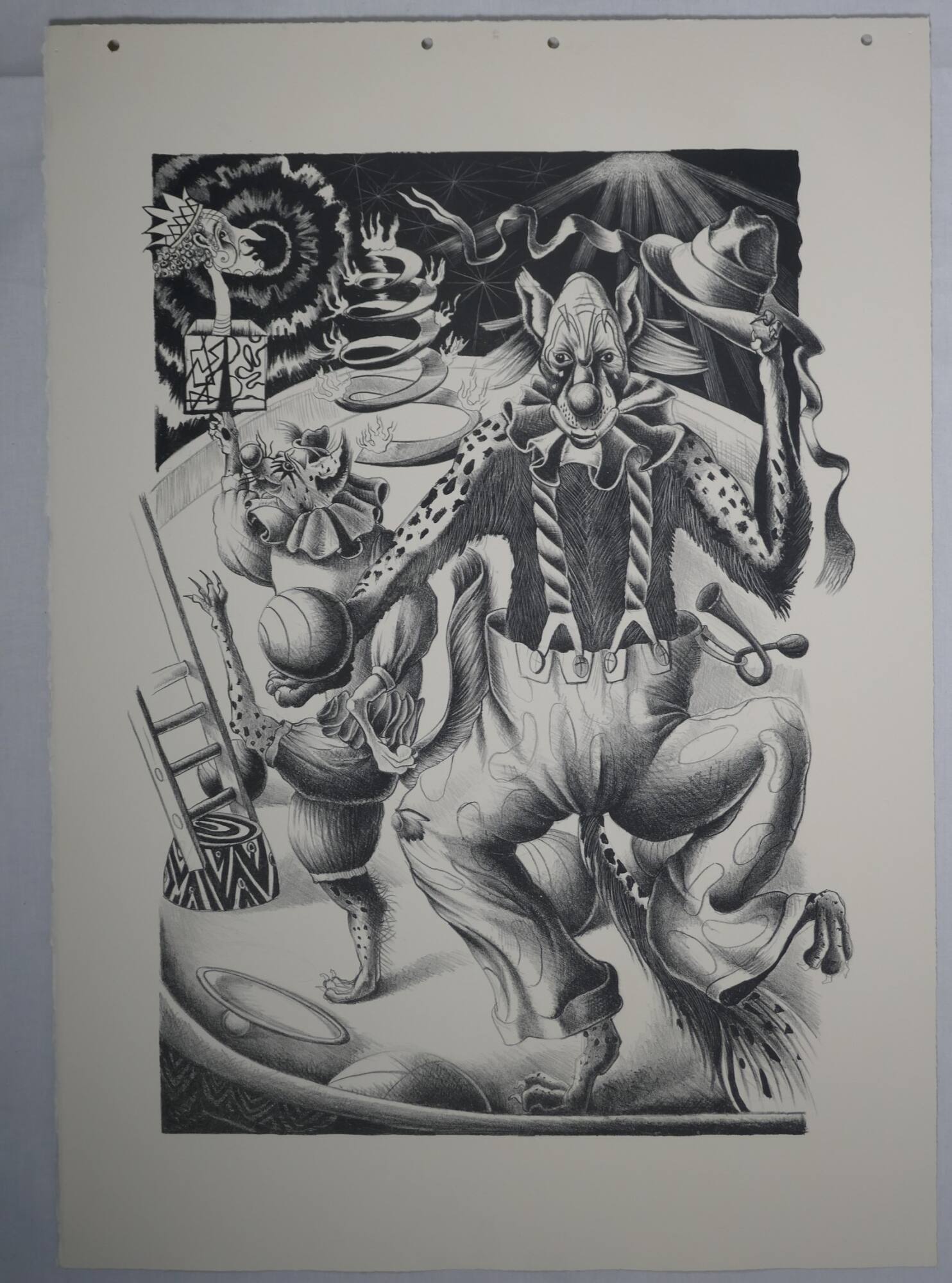DescriptionThis key stone proof is printed all in black on buff paper. The right half is taken up by a fox dressed as a clown in pants with striped suspenders and a ruff. He holds a brimmed hat with a creased crown and streamer in his proper left paw. He dances nimbly on bare hairy paws, a bushy tail spreading beneath his feet. He has clown makeup on his face and holds a ball in his proper right paw. Next to him on his left is another animal clown dressed in a costume with a ruff, with a curly tail. This clown holds aloft in his proper right hand a wand topped by a neck enclosed in a patterned box and a face in profile. The face wears a crown. Behind the clowns, a spiral spouting a flame. On the left of the image, a broken ladder over a ceramic jar and a ceramic bowl. In the background, concentric circles on the left and a sunburst on the right.Provenance