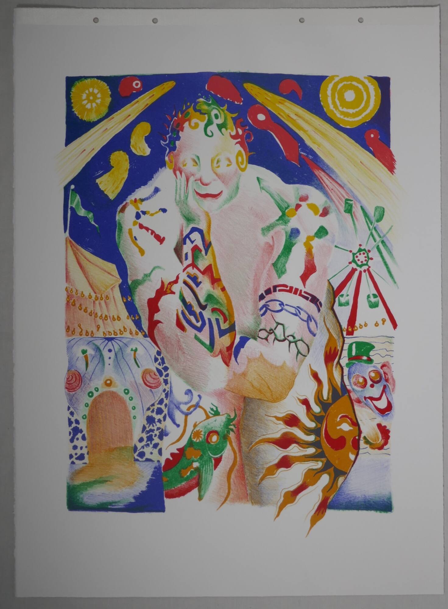 DescriptionThis full-color proof depicts a male figure who crouches or sits, a smile on his face, his head in his proper right hand. Red, orange, yellow and blue curls in place of hair and ears; a nose ring, and a greenish left cheek. Brightly colored tattoos cover his arms and legs, most notably a sunburst in black, orange and red on the side of his proper left thigh. A carnival tent with a curving entrance on the left. Fireworks overhead. On the right, a Ferris wheel and a painted clown’s face.Provenance