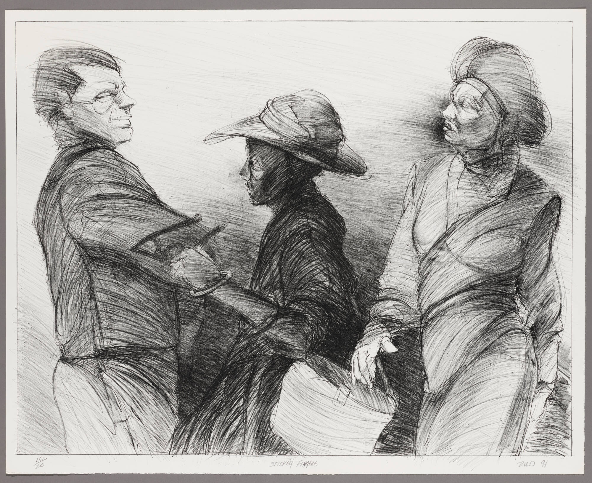 DescriptionThree figures in black and grey. A White man seen in profile gives a stern look toward an Asian(?) woman on the right. The woman, seen in three-quarter view facing left, is dipping her fingers into an open purse or basket slung over the shoulder of a Black woman in the center. The Black woman wears a hat with a wide brim and is seen in profile. Her proper left arm is bent and her hand blends with the man’s sleeve.Provenance