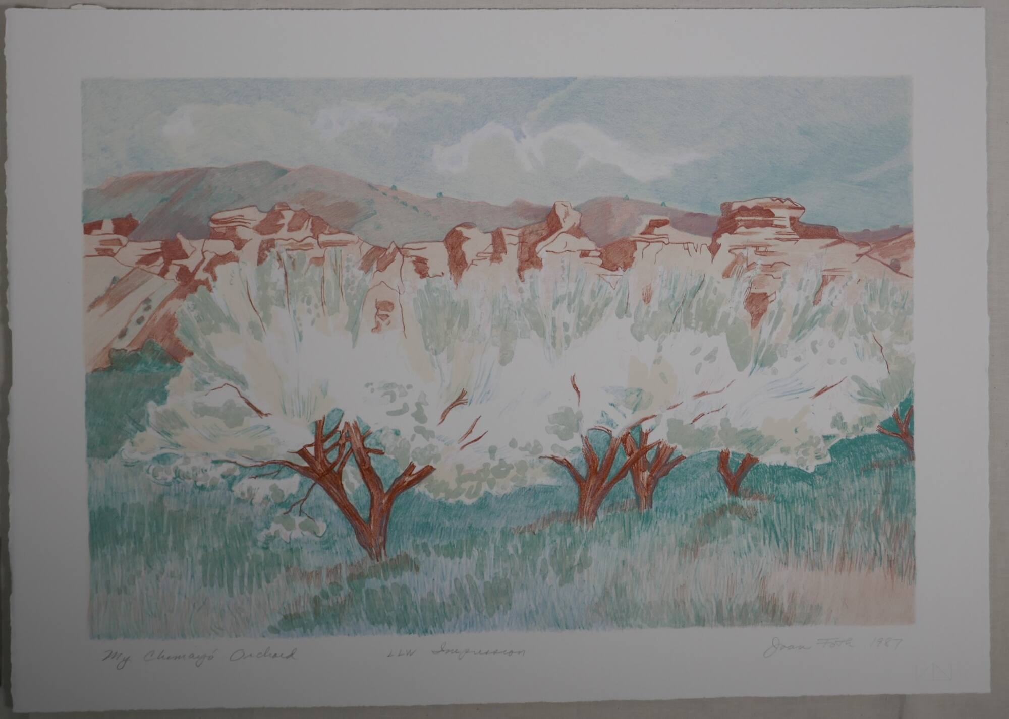 DescriptionGrove of four trees with white blossoms, set against aqua blue grass. Buildings in the distance seen over the tops of the trees and the mountains in the distance. A cloudy sky.Exhibition HistoryThe Lawrence Lithography Workshop: Highlights from the Archive. The Nelson-Atkins Museum of Art, Kansas City, MO. December 21, 2024 - June 22, 2025.
