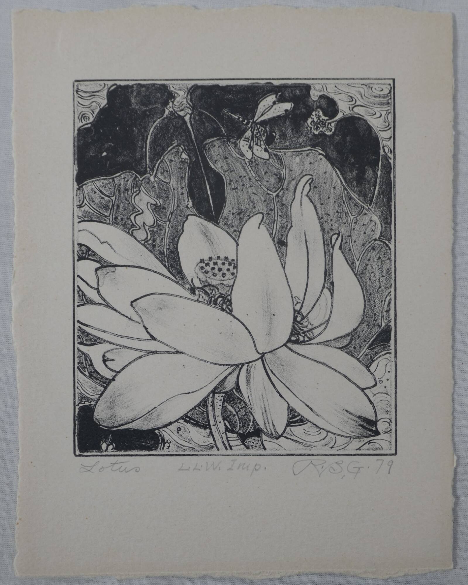 DescriptionThis horizontally oriented lithography is printed in black ink on light-colored paper. It features a large lotus blossom (mutliple, vaguely ovid-shaped petals) that occupied the lower two-thirds of the composition.Provenance