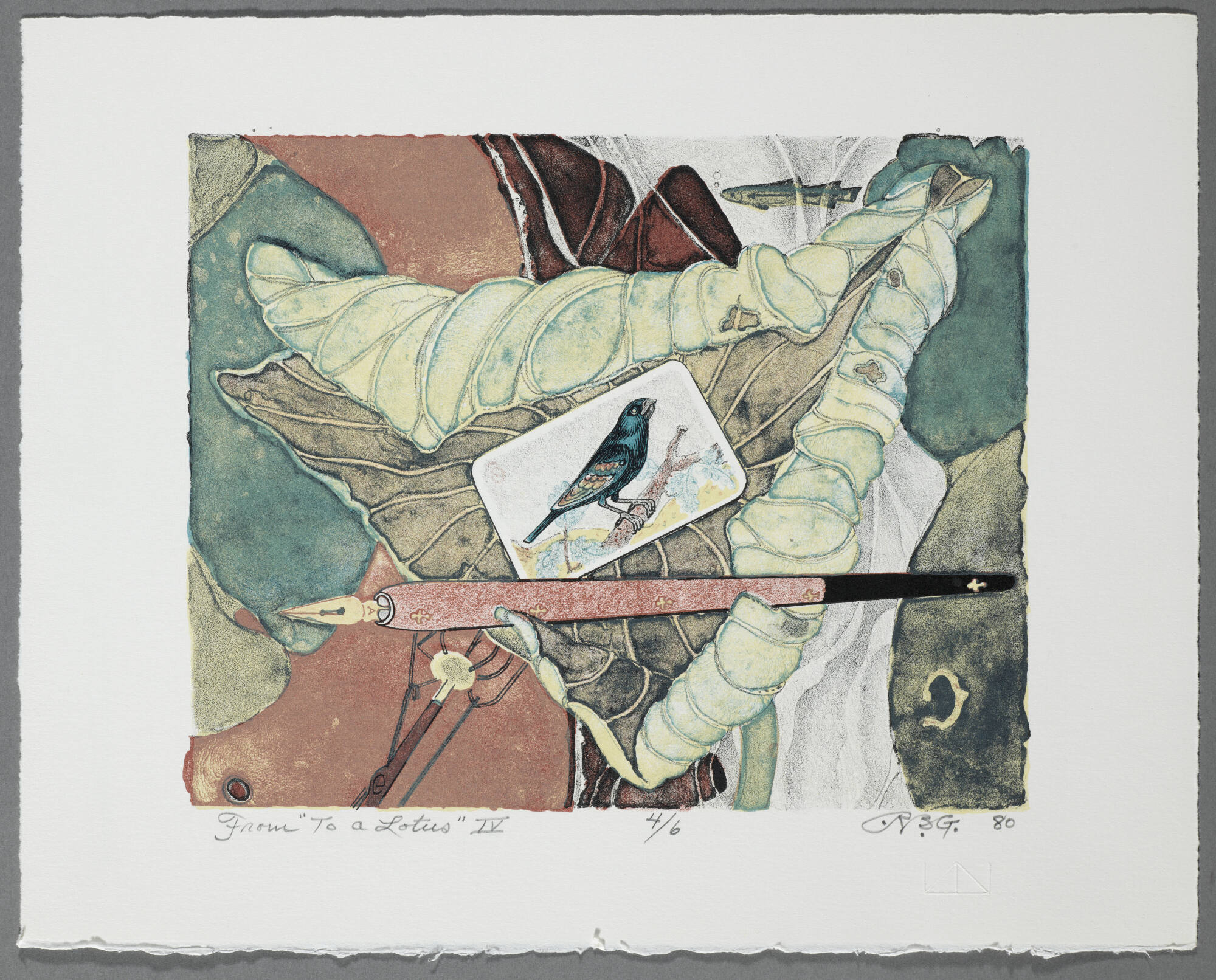 DescriptionA bold red dipping pen with a gold nib and dark blue end dom inates the foreground, balanced on the curling ledges of a large veined leaf that’s brown on the inside and yellwo-blue on the outside. A card with a blue bird on a branch above the pen. A small fish swimming to the left above the leaf. The leaf rests on a brown curving form in the lower left. Dark blue-green background.Provenance