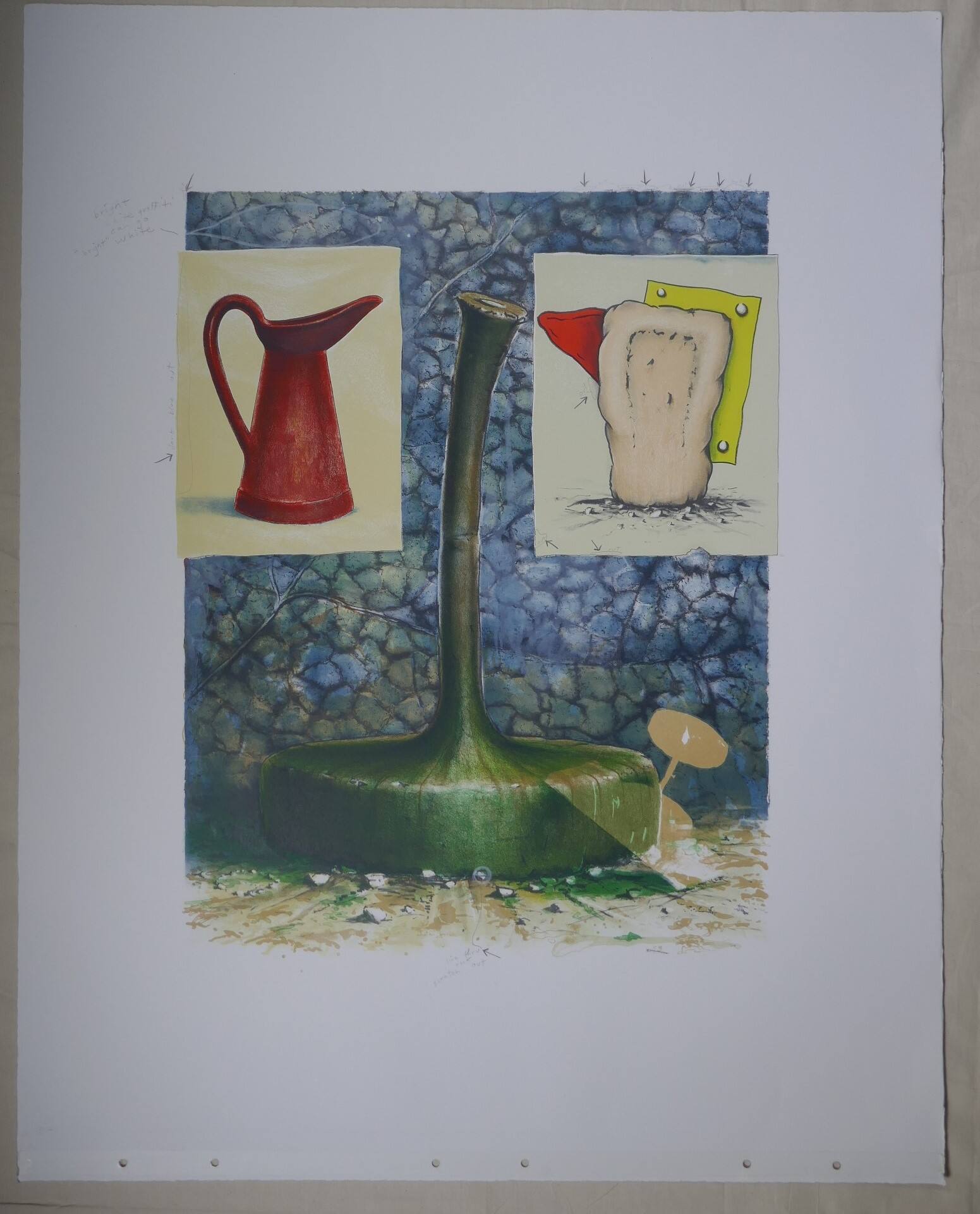 DescriptionA vegetable form with a round green bottom and a long brown stem leaning to the right sits on a support of short wood planks leading away from the viewer and giving depth to the scene. A short wood plank to the right is propped up in the plant and supports a small “dumbbell” of green matter. The background is pebbled stones mostly in shades of blue. Two prints appear near the top of the print – a red pitcher on the left and something in cream, yellow, and red on the right. (I cannot for the life of me put a name to it.) It is unclear whether the prints are attached to the pebbled background or float in front of it.Provenance