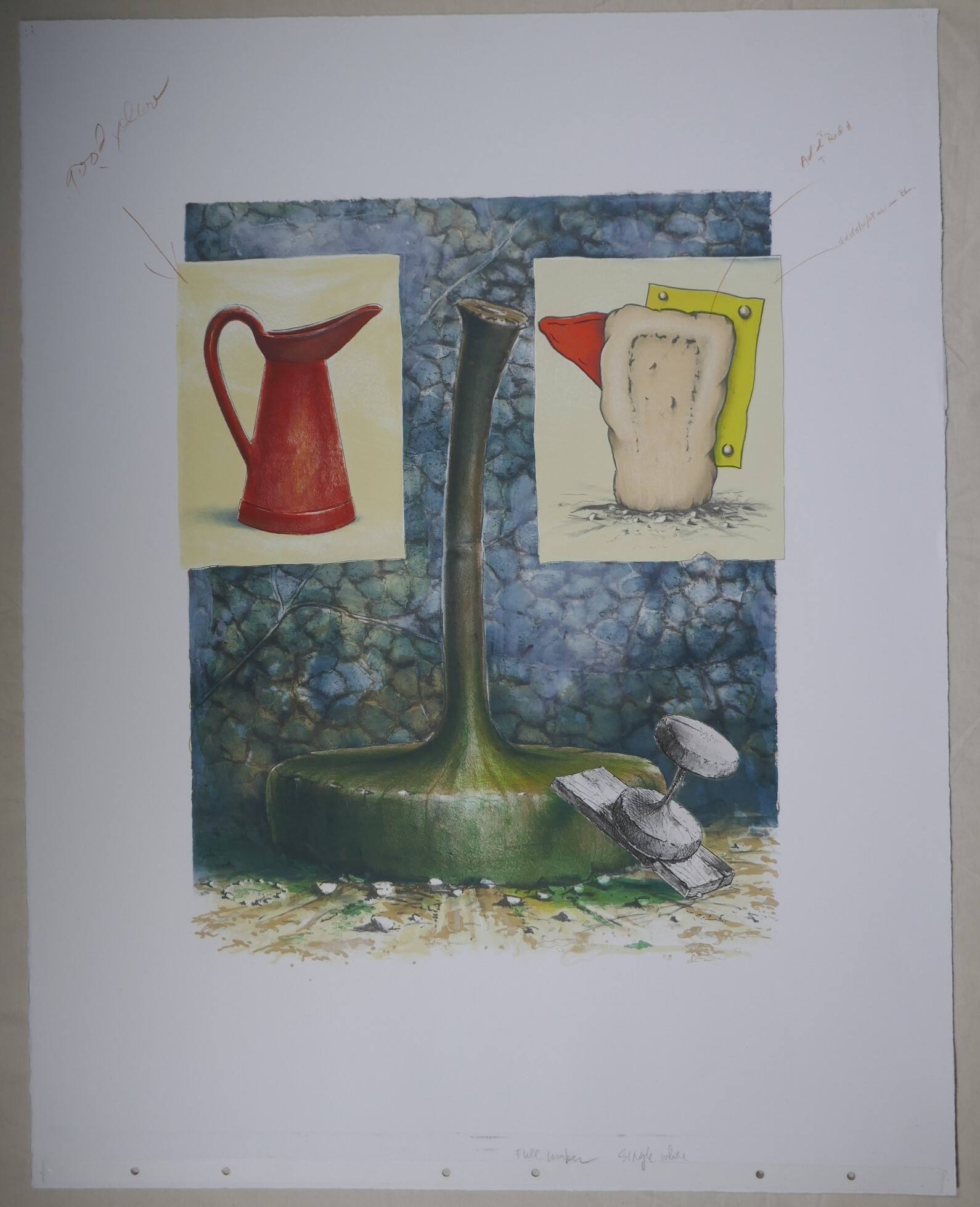 DescriptionA vegetable form with a round green bottom and a long brown stem leaning to the right sits on a support of short wood planks leading away from the viewer and giving depth to the scene. A short wood plank to the right is propped up in the plant and supports a small “dumbbell” of green matter. The background is pebbled stones mostly in shades of blue. Two prints appear near the top of the print – a red pitcher on the left and something in cream, yellow, and red on the right. (I cannot for the life of me put a name to it.) It is unclear whether the prints are attached to the pebbled background or float in front of it.Provenance