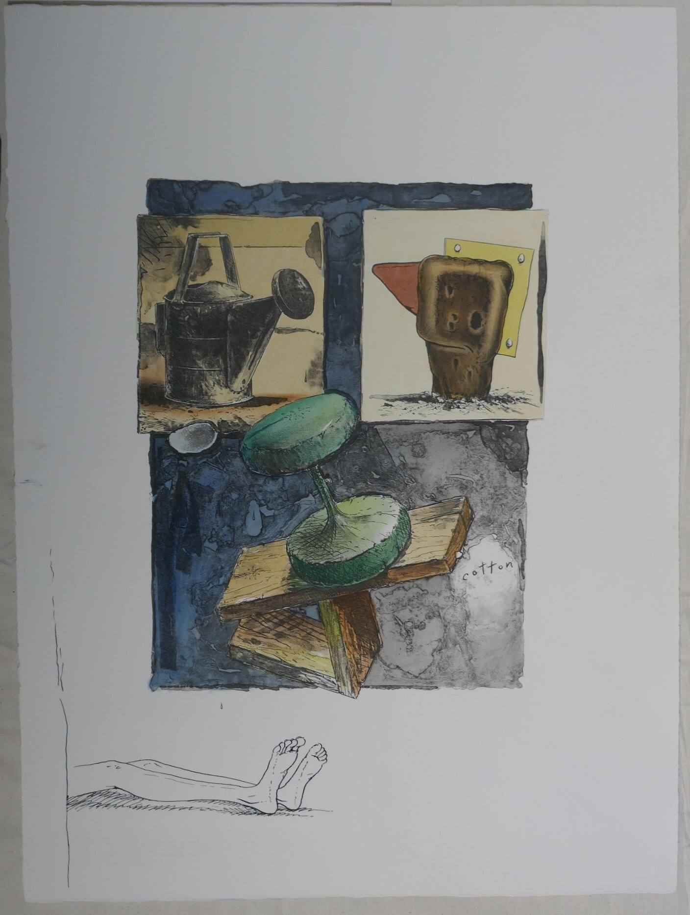 DescriptionIn the lower half of the print, a sloping wooden support holds a “dumbbell” (more like two shortbread cookies connected by a straw). The background of the print is crowded but unclear whether it depicts something in particular. Two prints float in front of the background. On the left, a watering can. On the right, an unidentifiable something.Provenance