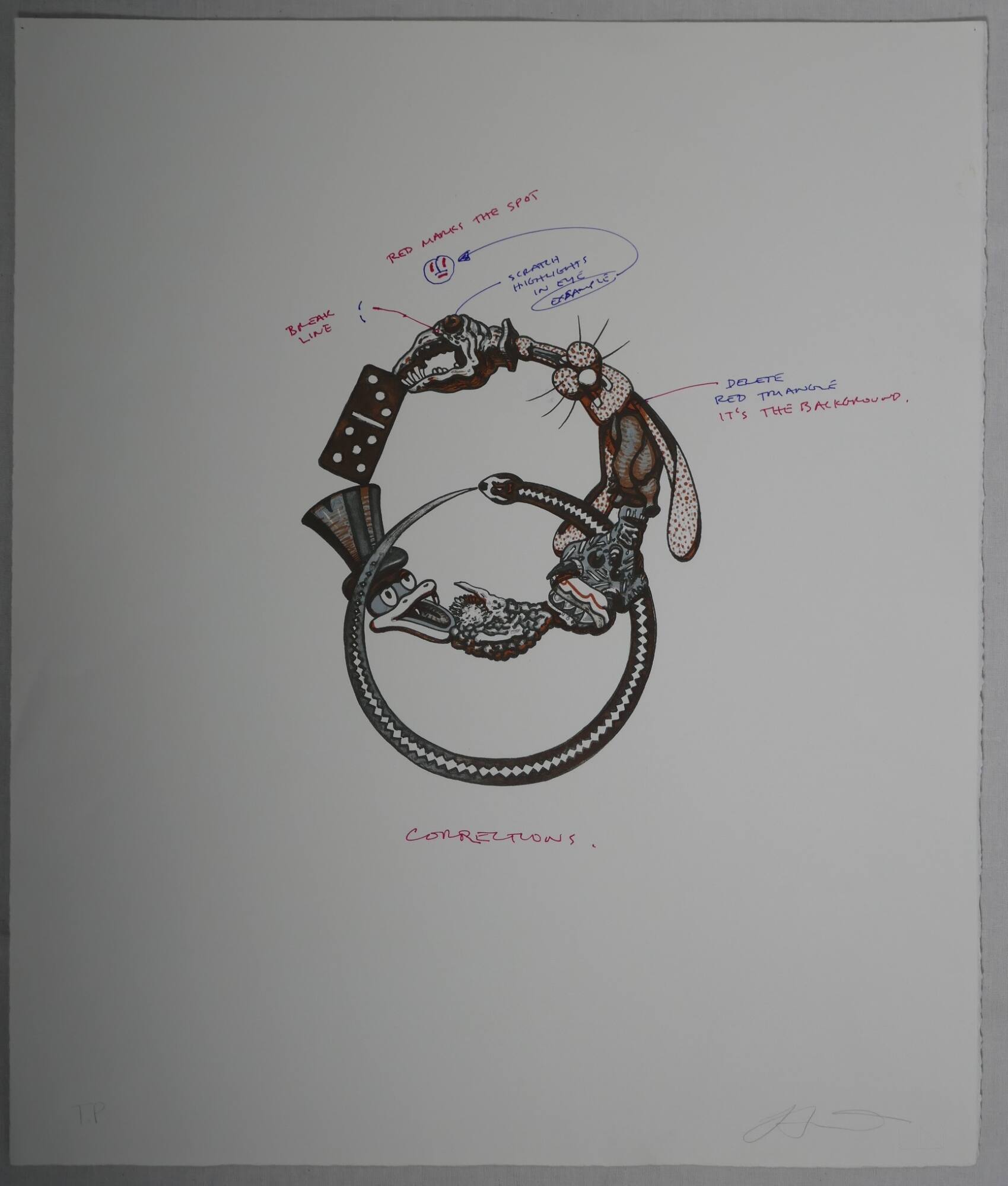 DescriptionThis color trial proof on white paper with multiple handwritten notations surround the images features two intersecting rings against a plain grey background. The front ring is in the shape of a snake biting its tail. The ring behind is a series of connected objects. Counterclockwise from the top – a mailed right hand facing left and holding a domino with eight dots, a cartoon duck’s head in a striped top hat, a jeweled shape at bottom, another shape that snaps over part of the snake ring, and white appears to be a red body with a fly’s face and long wings dotted in red.Provenance