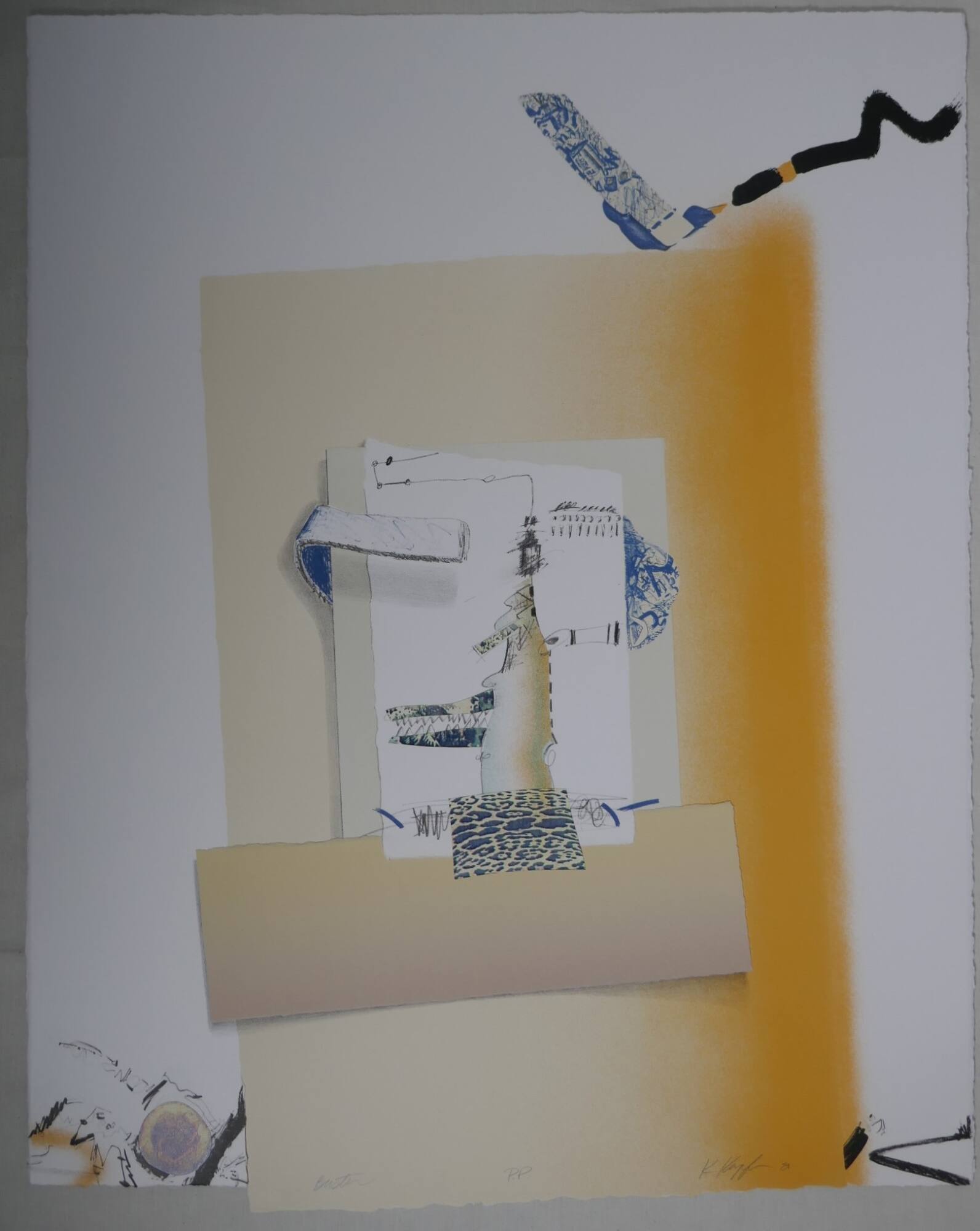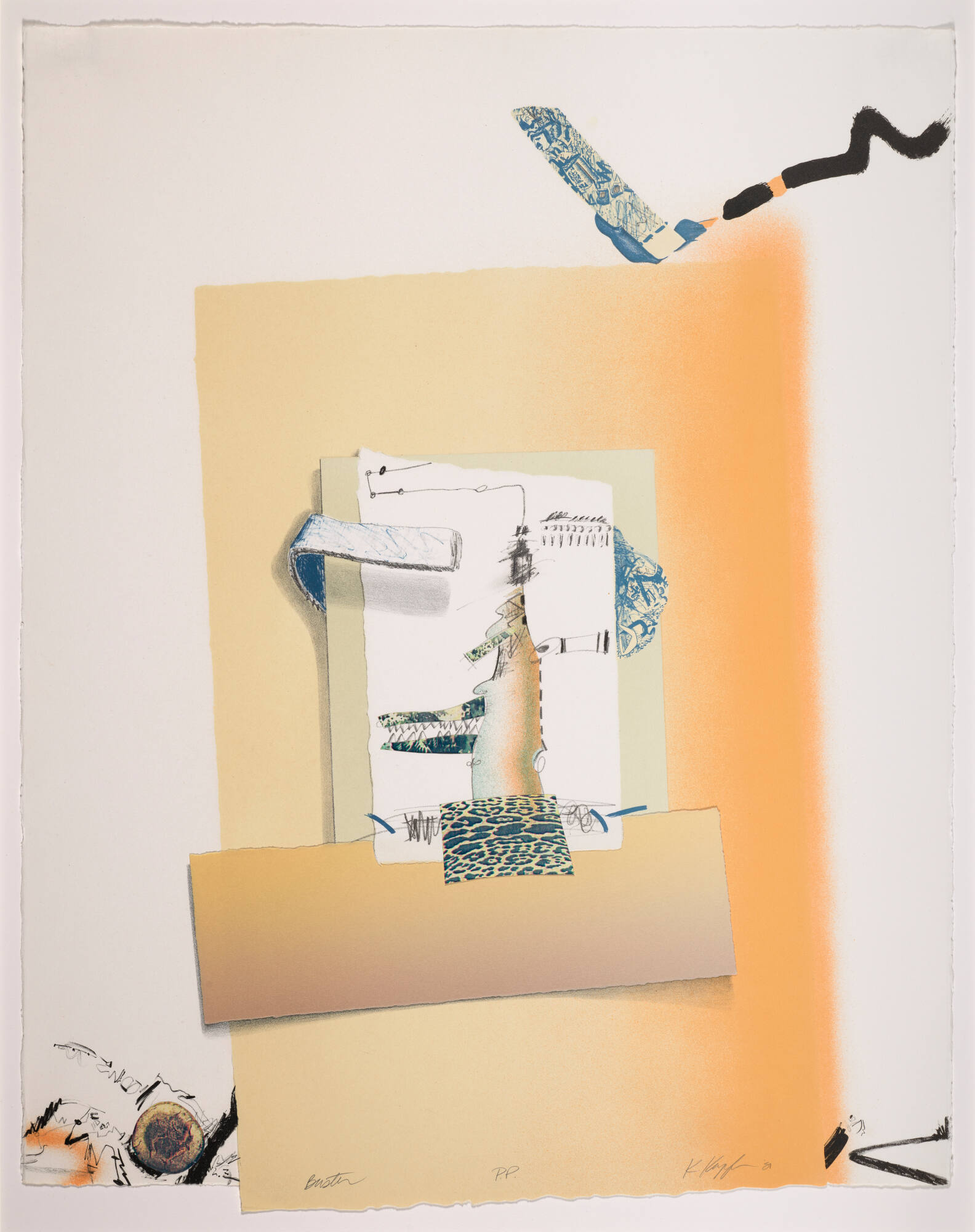 DescriptionThe top paper has a vertical orange line – a man standing on a black and white mat? – next to a white vaguely architectural shape that’s superimposed on a sketch of a dog’s head facing right. A bit of the dog’s rear end is seen on the left, with its tail folding over the top page. A strong line of tan paper underneath these. The whole superimposed on a sheet of paper with a strong orange right edge. Black squiggles in three corners.Provenance