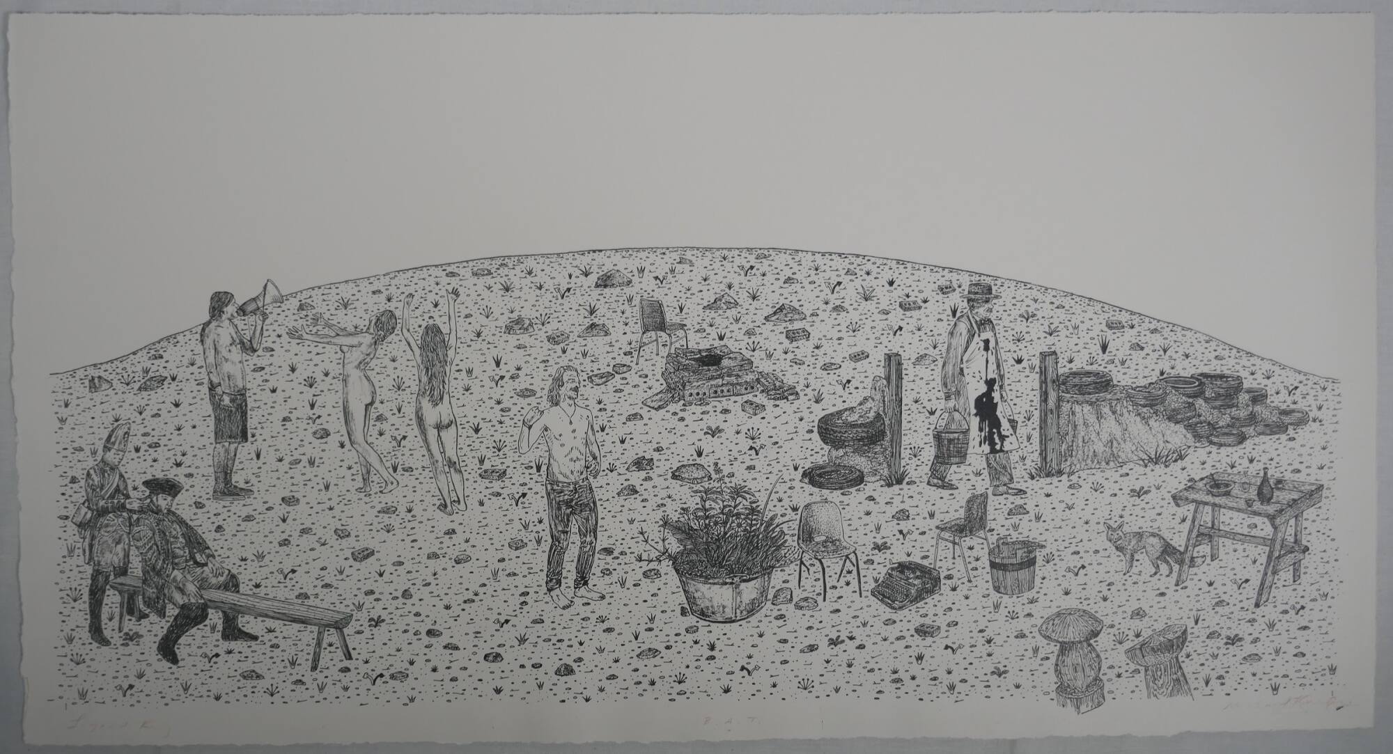 DescriptionThe Lizard King not shown on the website. Gently curving pebbled landscape with people. Lower left, an 18th-century soldier in a tricorn hat seated on a bench, a soldier with a tall helmet standing over him. Above them, a bare-chested man and two naked women. In the center, a bare-chested man and a big plant in a basket. Lower right corner, stone piles and a table. Above that, a large figure in an apron, carrying a bucket and striding to the right.Provenance