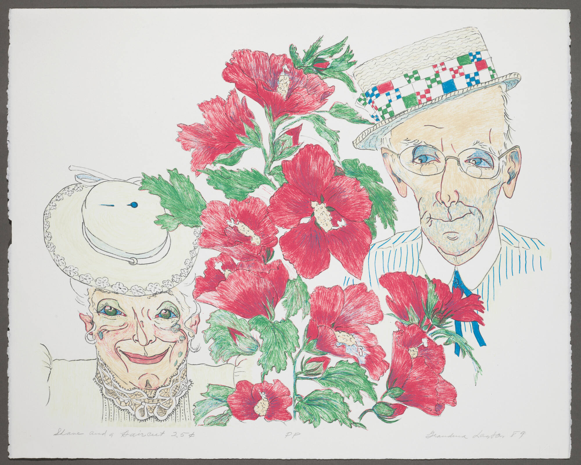 DescriptionOn the left, the head of a smiling old woman in a round hat. In the center a flowering red hibiscus bush with green leaves. On the right, the head and shoulders of a smiling old man. He wears a hat with a checkered hatband in colors, glasses, and a striped shirt with a white collar.Provenance
