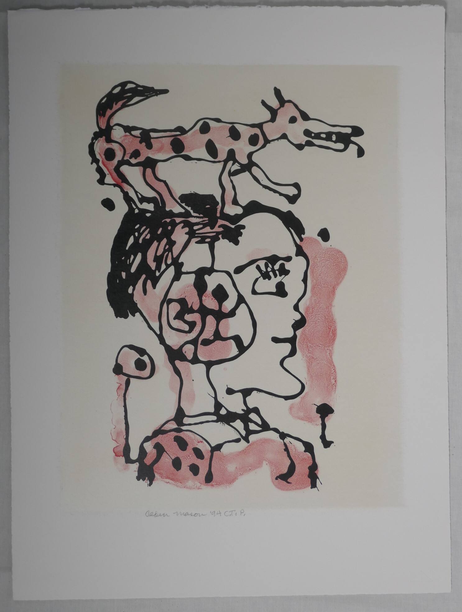 DescriptionThis two-color lithograph depicts the head and shoulders of a man seen in profile facing right, his proper right forearm raised. A spotted yellow-green dog facing right stands on his head. On the side of his head, the man wears a medallion with two dancing figures.Provenance