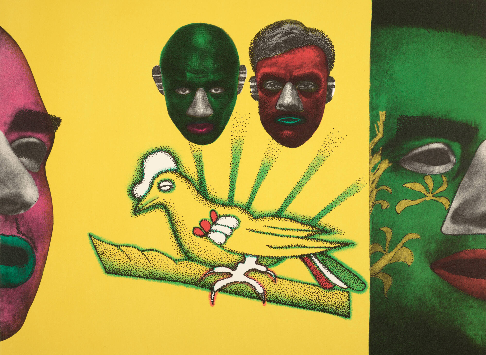 DescriptionThis is a four-color lithograph proof for Trabajo. On the left edge of the print, part of a man’s face partially turned to our right. The cheeks, forehead and chin are maroon; the open mouth is green; the nose is grey and the eyebrows are black. The ground color is a brilliant yellow. To his right, a bird (pigeon) facing left in profile with its feet on some sort of free-floating support. It has white feet, a “pompadour,” red and white shoulder feathers, and red and green tail feathers. Green rays emanating upwards from its body point to two small dark grey male heads. The head on the left has a green forehead and the one on the right a red headband. On the right edge of the print, a man’s face with green skin, yellow floral designs on its proper right cheek and temple, a grey nose and eyelids, and a red mouth.Gallery LabelEd Paschke collected media images, like newspaper photographs, to fuel his compositions. Coming from Chicago to The Lawrence Lithography Workshop, he brought images from his personal archive. About the combination of imagery that resulted in Trabajo Paschke wrote: “The diversity and range of humanity is represented (Black–Hispanic–white) in conjunction with a large bird. Racial and ethnic differences tend to create conflict and divide people. The bird represents the work (trabajo) through which people overcome their differences and build a better world.”