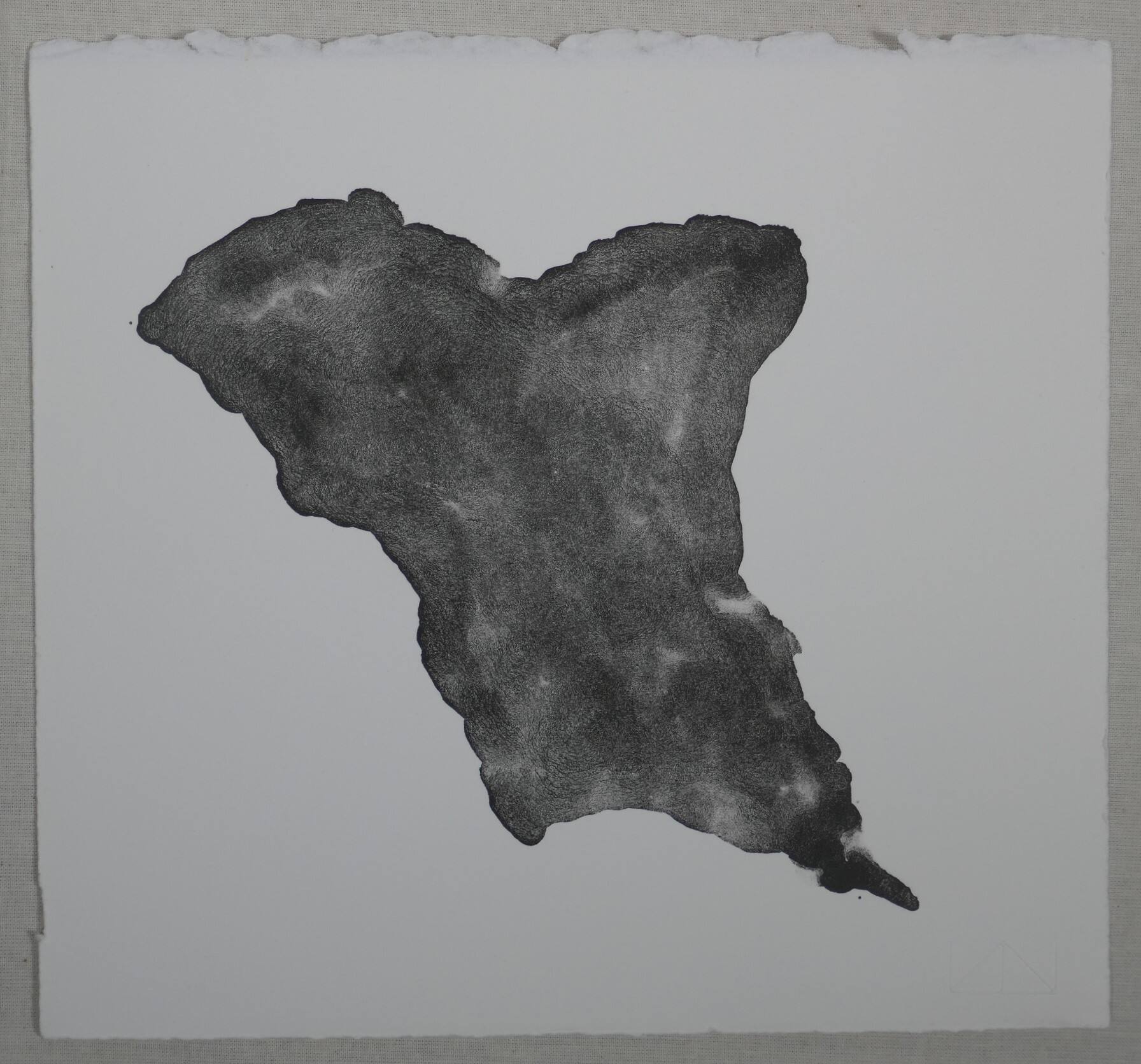 DescriptionAn irregular shape in streaky black that suggests a long-eared dog in profile, with thick front legs, tiny back paws, and a stump of a tail.Provenance