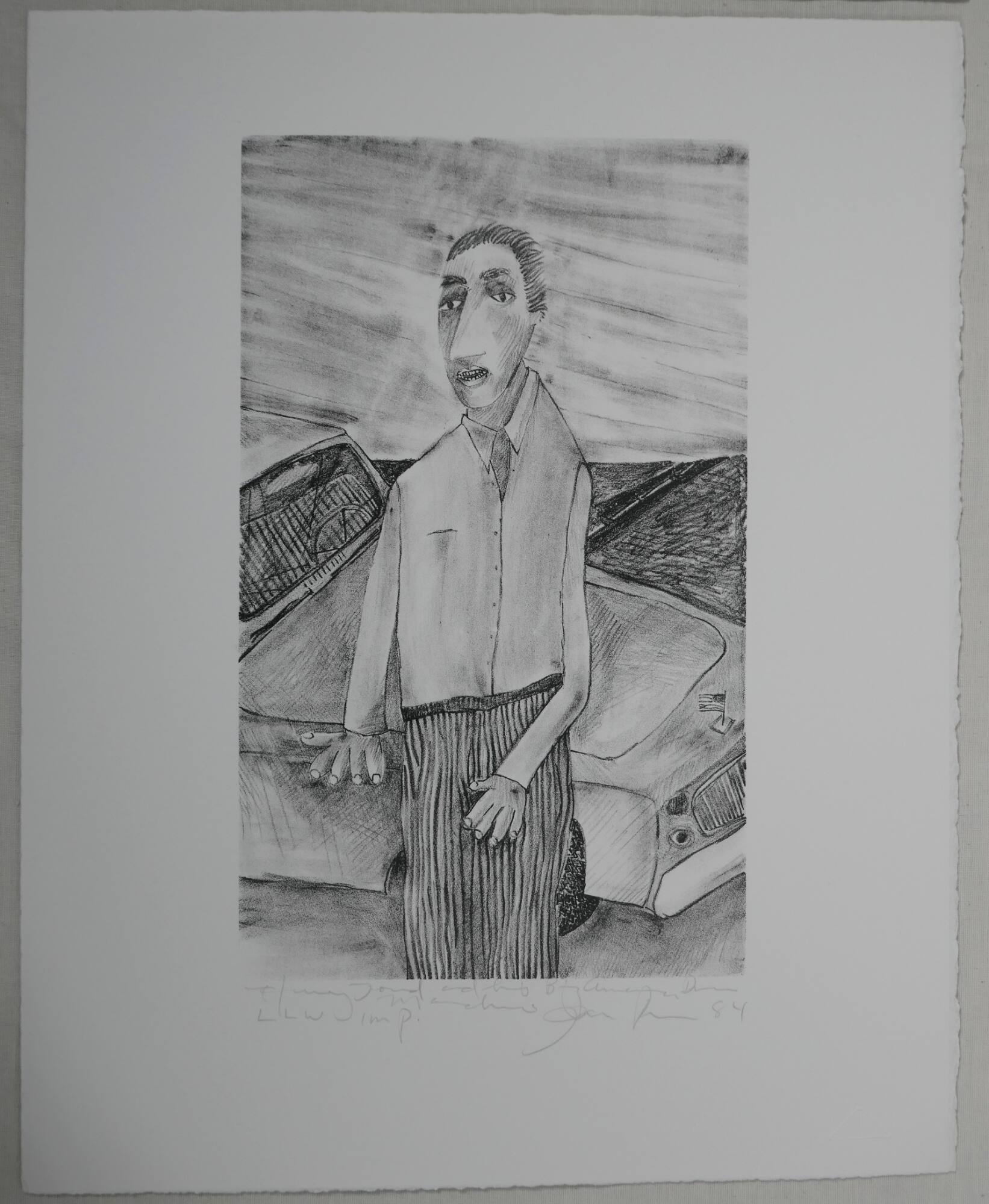 DescriptionA man in a shirt, a tie, and striped trousers, seen from the thighs up, stands in front of a car seen from the side and slightly above. He gazes toward the left into the distance. He has a mustache. He holds his hands in front as if not sure what to do with them. The car is rectangular-built with striped cloth seats visible through the windshield. A streaked landscape and sky can be seen on the other side of the car.Provenance