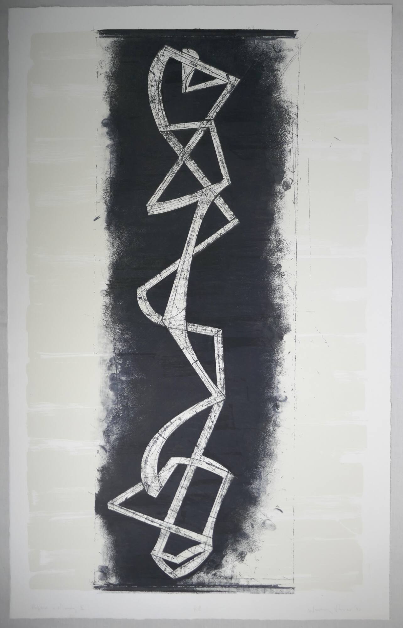 DescriptionThis proof for "Reflex and Memory I" hasThick white lines against a black field with soft, feathery edges. The thick lines, covered with fine black lines in irregular patters, intersect to create thirteen geometric and irregular shapes.Provenance