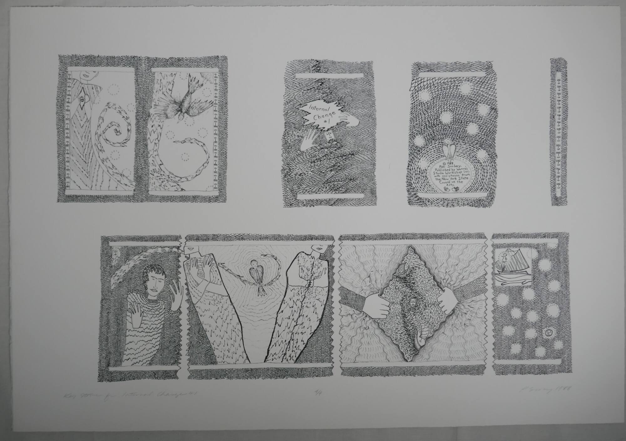 Folding print of 8 panels: a blank followed by a figure holding a green plant. Panels 3 and 4 are one roughly heart-shaped image: a white diagonal bordered in pink, a central section in pink and yellow with a bird perched on it, and a large orange and yellow leaf on the right. Panels 5 and 6 are one image of two hands reaching toward a diamond shape in the center, with red concentric circles in the background. Panel 7 contains a pattern of blue and white circles with a rectangular image on the upper left. Panel 8 is blank.