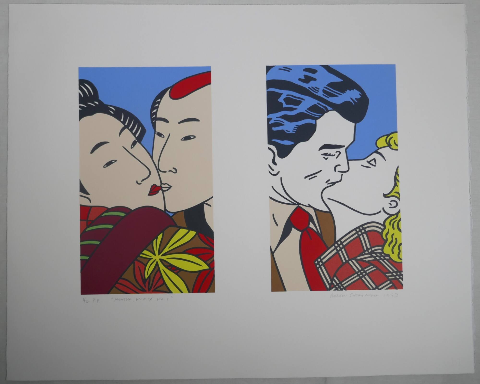 DescriptionTwo images on one sheet. In the left image, the heads a Japanese man and woman come together for a kiss. She(?) wears a brown kimono with yellow, red, and orange flowers and a sash(?) of dark red. In the right image, a white man with blue-black hair, red tie, and brown jacket kisses a blond woman in a red and white checked coat. Each scene is set against a light blue background.Provenance