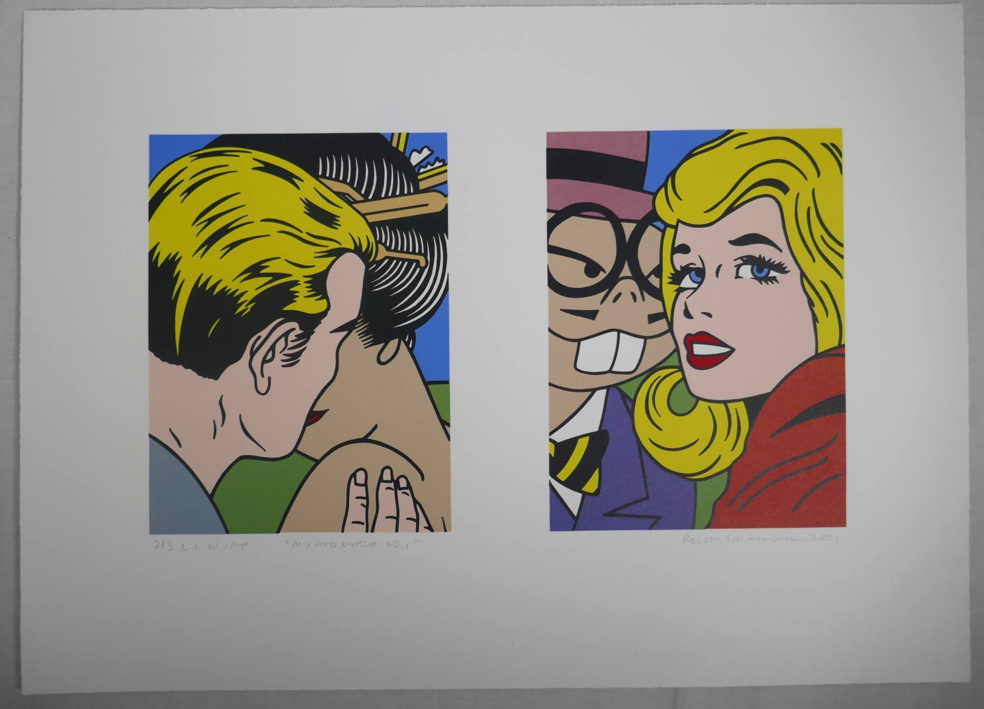 DescriptionTwo images on one sheet. In the left image, a white man with blond hair kisses a Japanese woman with an elaborate hairdo. Her neck and shoulders are naked. His proper right hand presses into her shoulder. In the image on the right, a caricature of a Japanese man with rabbit-like front teeth, round glasses, mustaches, and slanted eyes, dressed in a blue suit, a black and yellow striped bowtie, and a brown hat faces right to leer at a white woman with blonde hair and blue eyes, dressed in a red coat. She turns to face us in three-quarter view.Provenance
